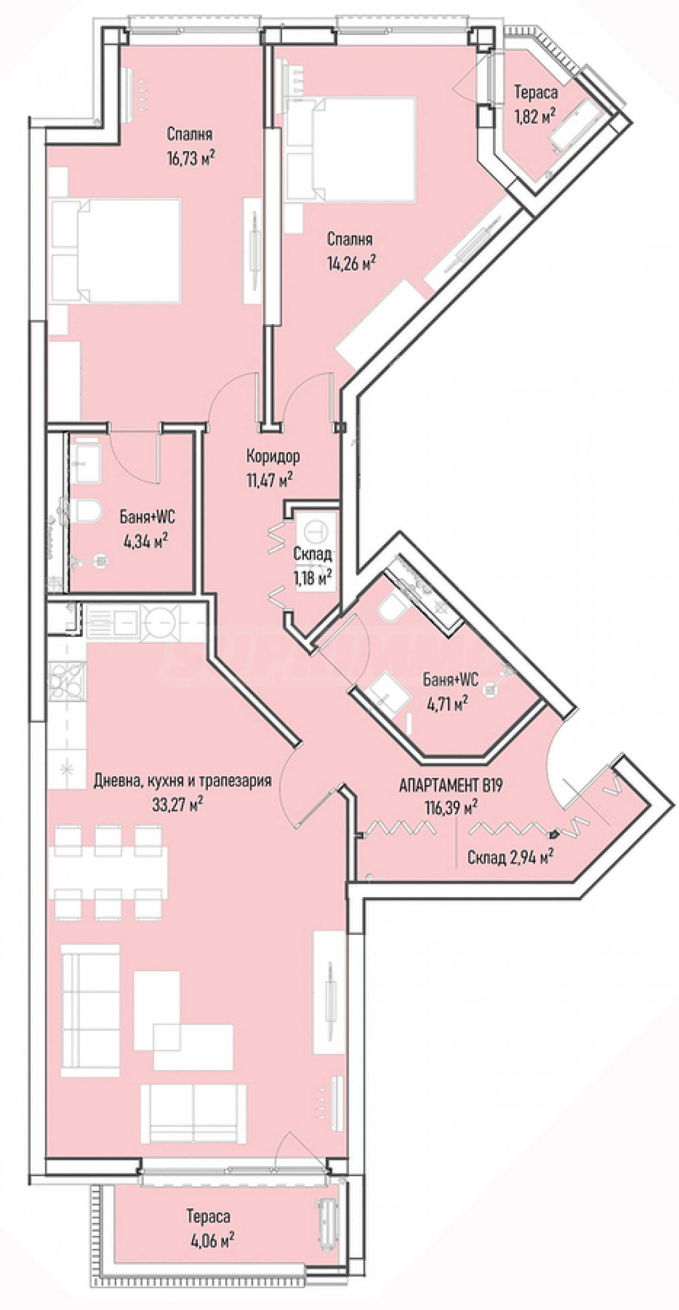 We present a two-bedroom apartment for sale in a modern building, with a luxurious facade and finishing works near Business Park Sofia.