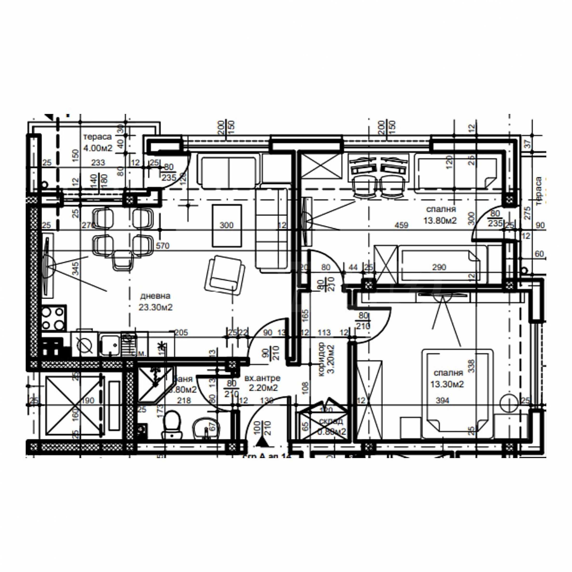 We present a two-bedroom apartment in a new complex, in the "Belomorski" district. Convenient location near a public transport bus stop.