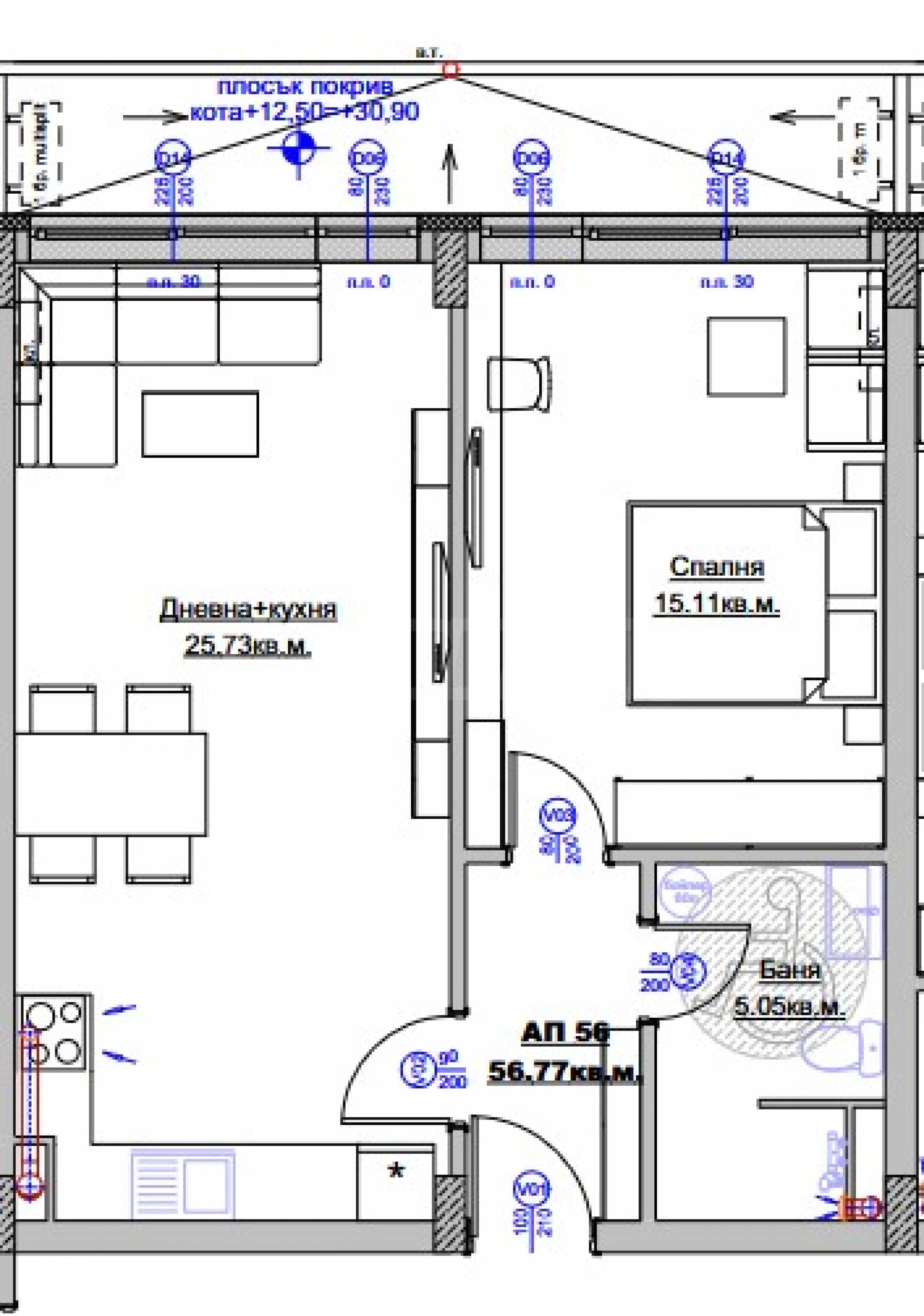 The property has a total area of 68.54 m2., located on the 4th floor and consists of an entrance hall, living room with kitchen, bedroom, bathroom with toilet. It is being let in a state of completion according to Bulgarian Construction Standards, with plaster and screed.
