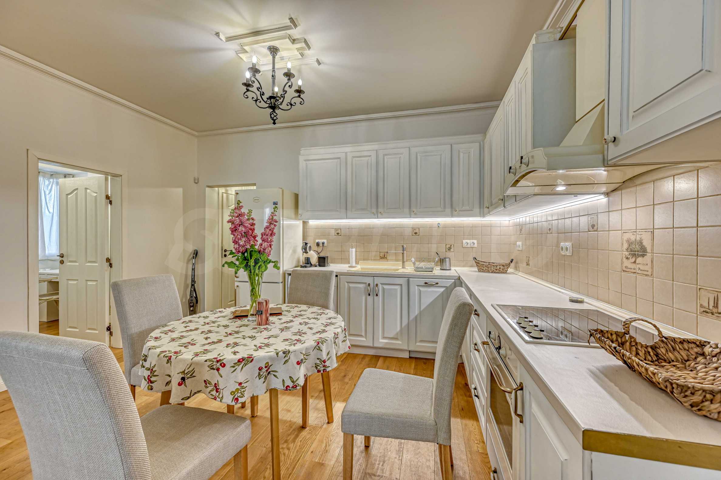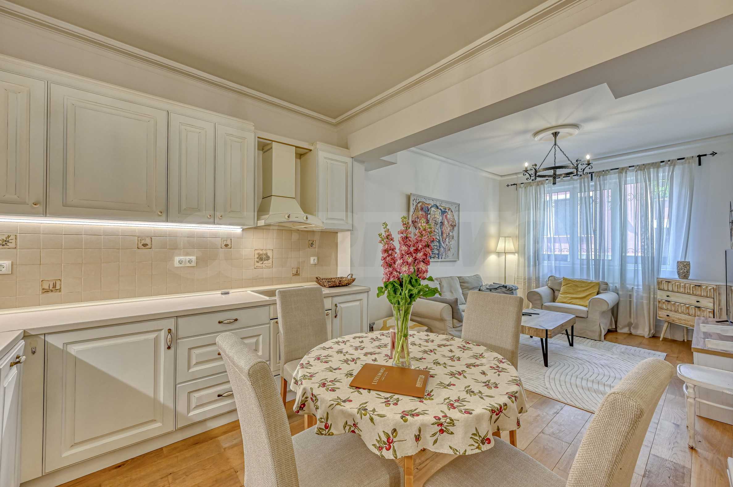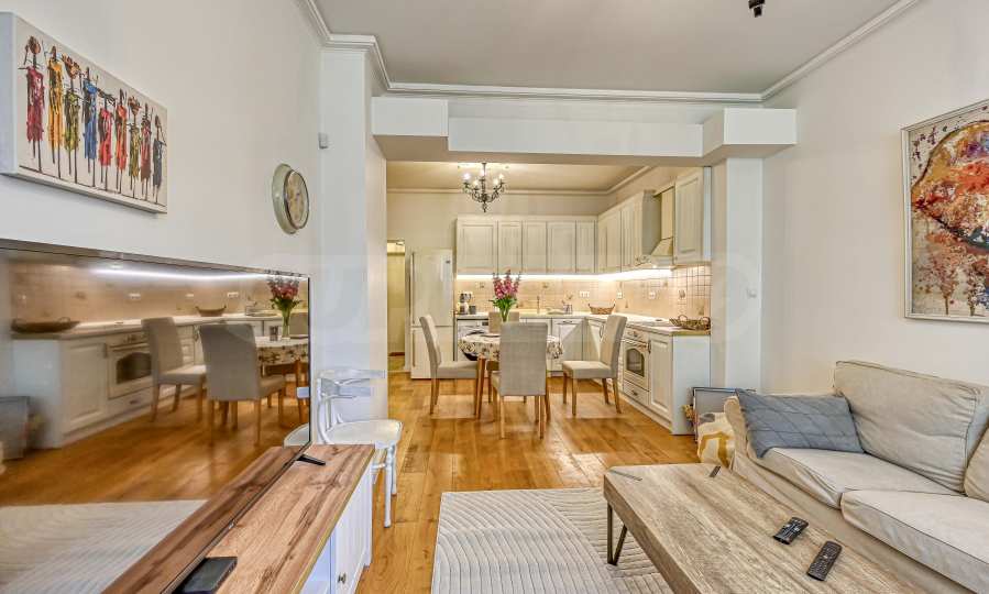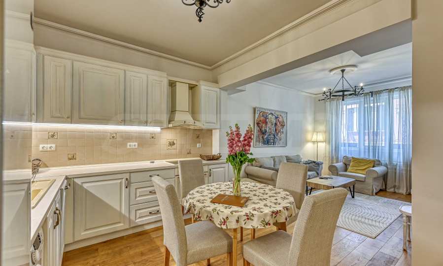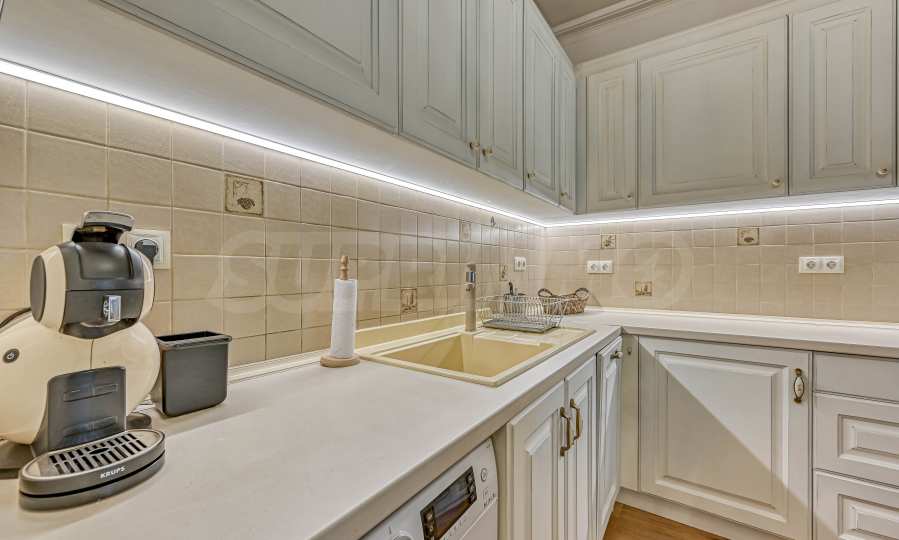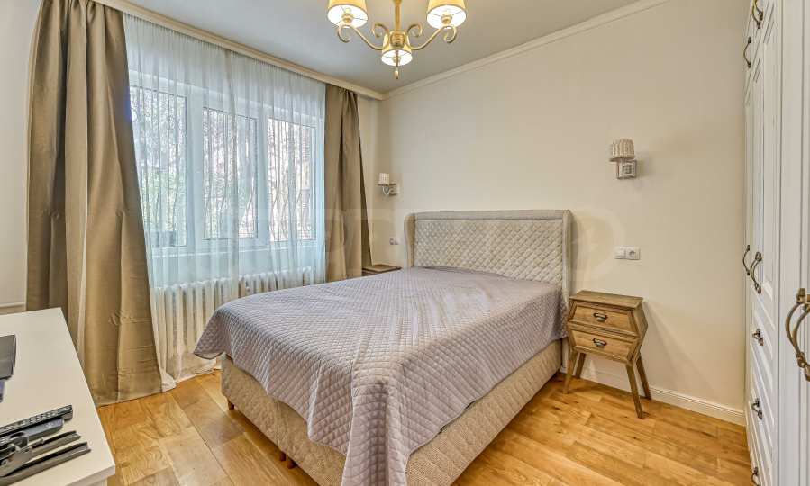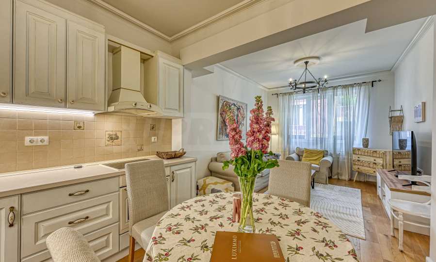 The apartment is being sold fully furnished, with new equipment, decorated in a contemporary style. The apartment has high ceilings and excellent natural lighting, which creates a feeling of spaciousness and homeliness.