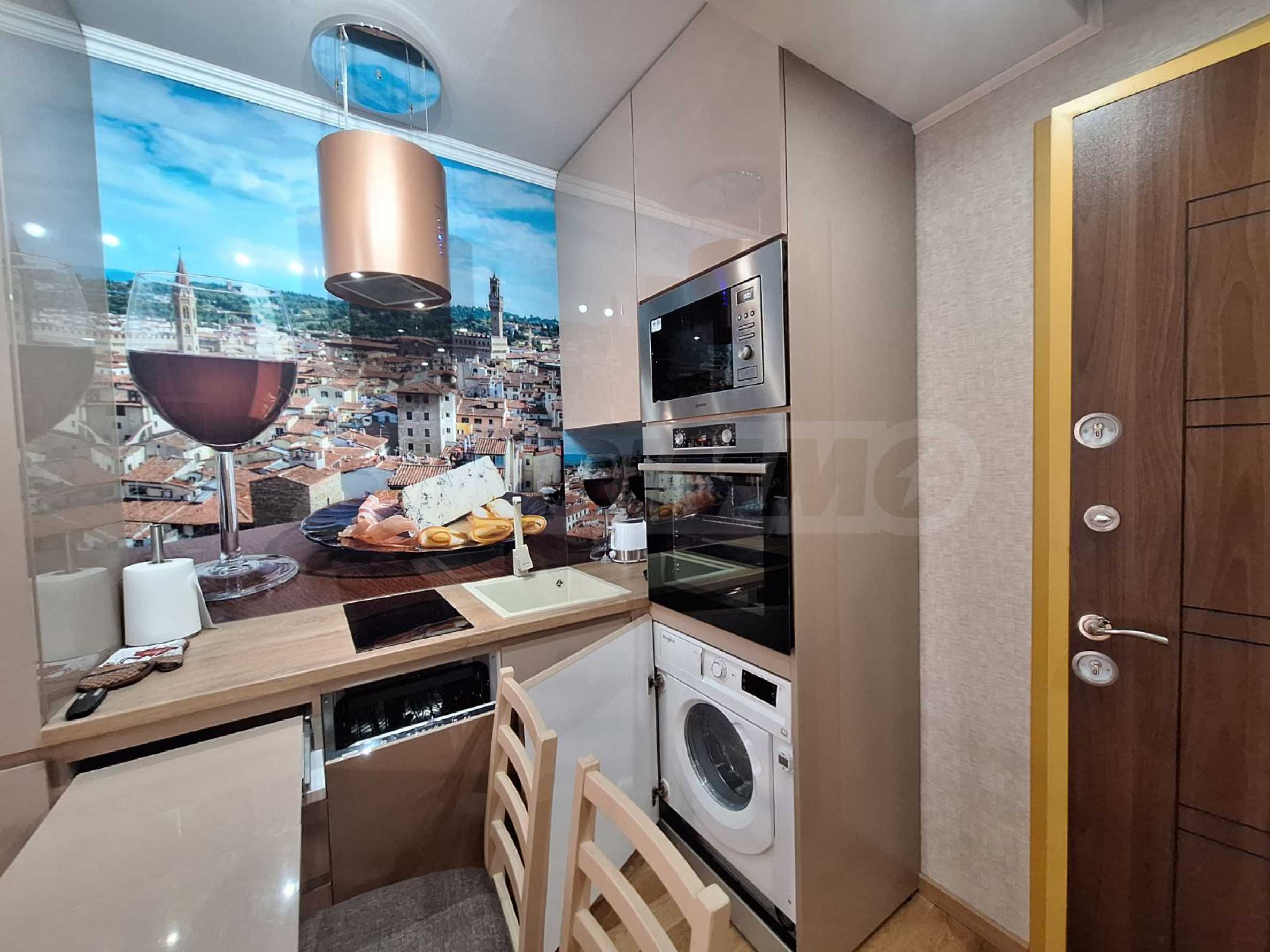 Kitchenette with high-end appliances: dishwasher, washing machine, large refrigerator, oven, 2 hotplates, extractor hood and bar counter with 4 chairs;