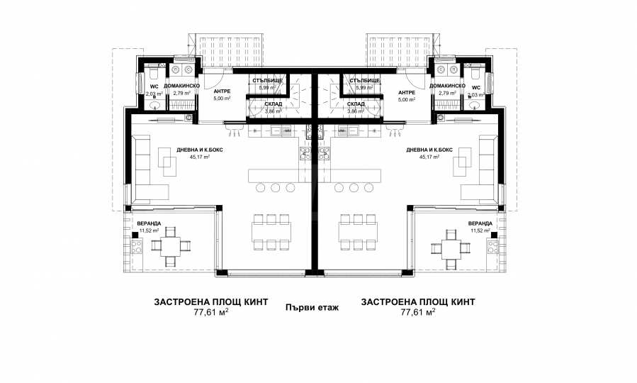 - first floor: spacious living room with kitchen, bathroom, storage room and veranda;
