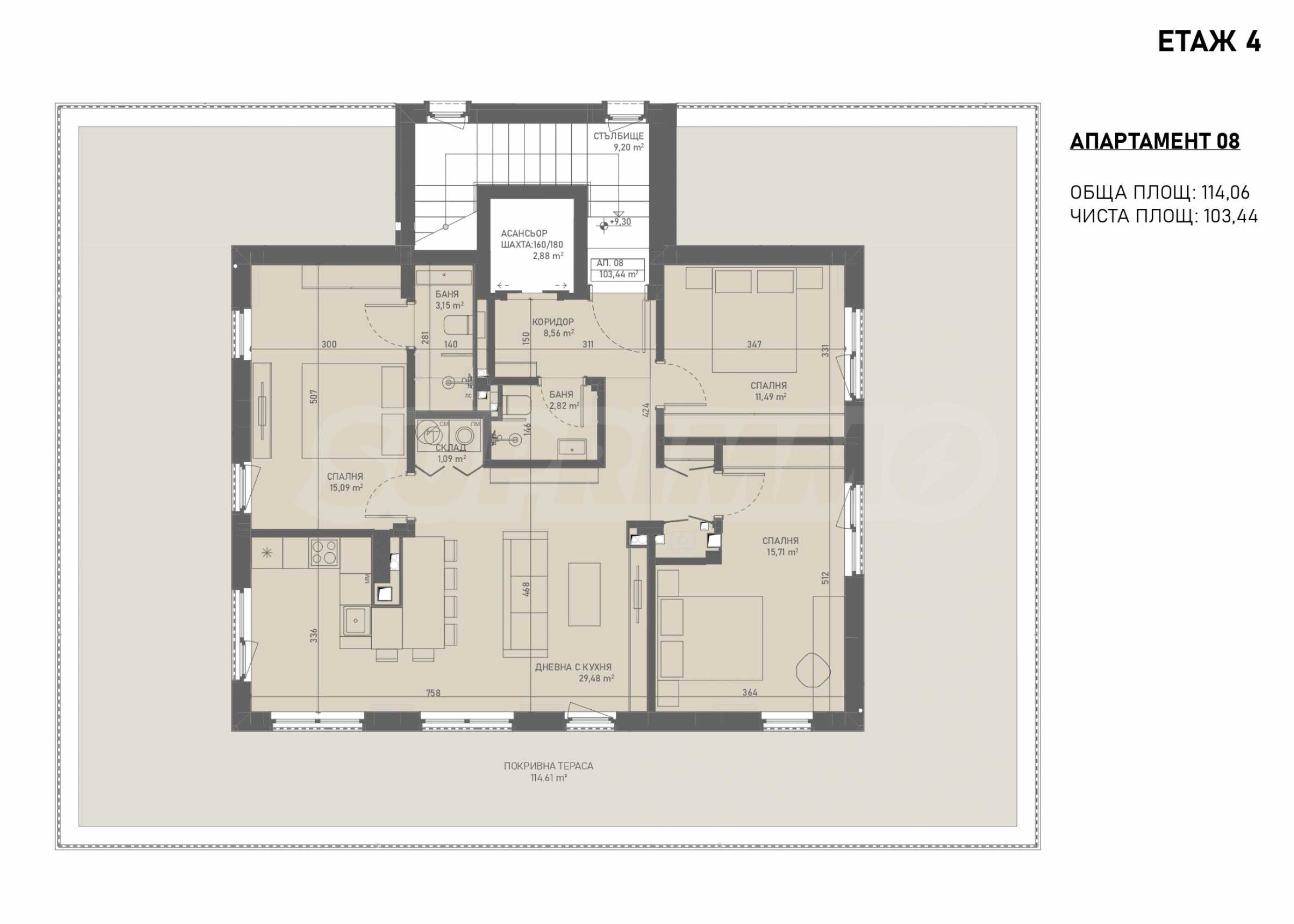 The apartment is located on the 4th floor and has a total area of 114.06 sq m. It is sold with high-quality finishing according to BDS.