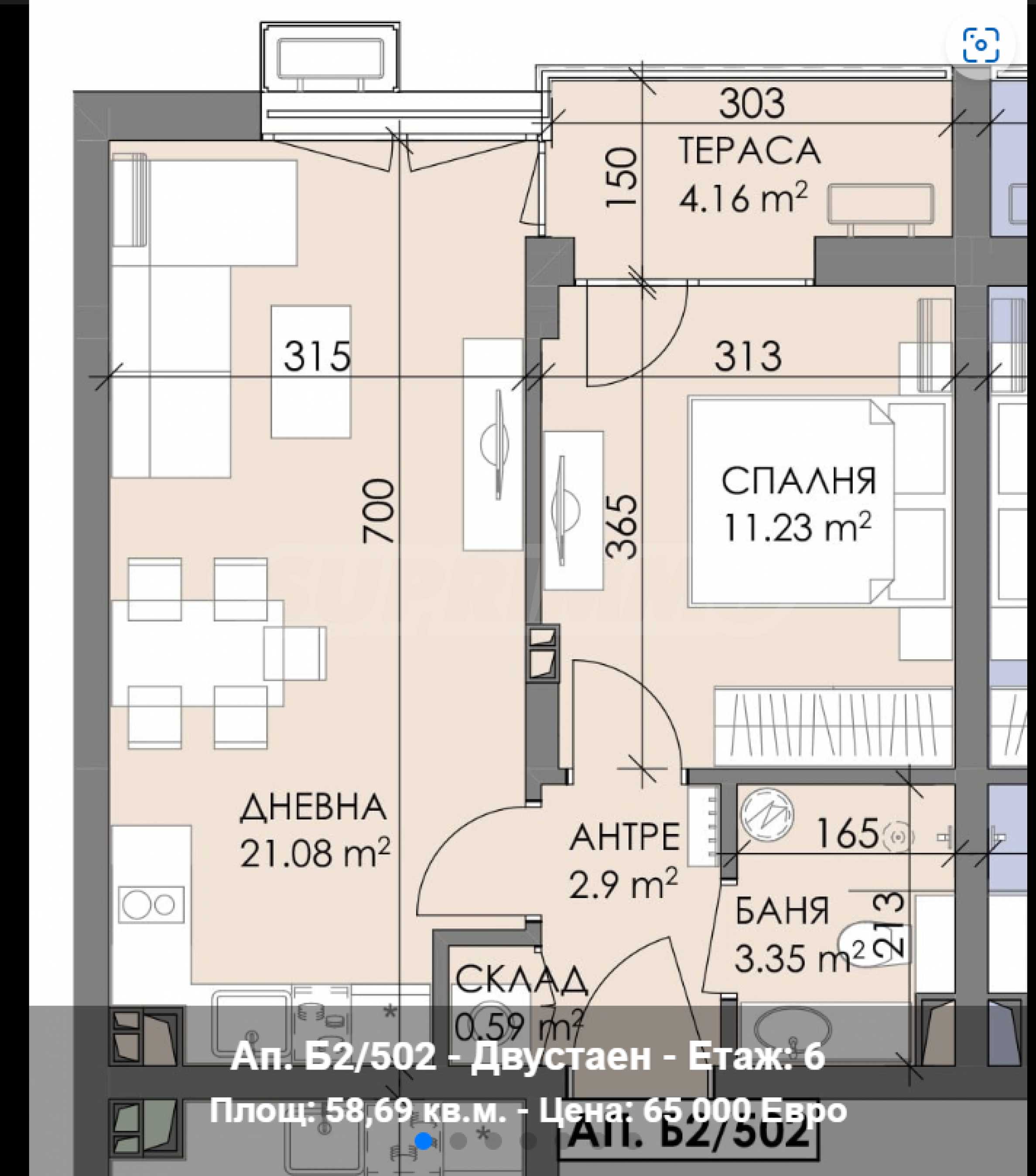 The apartment has a total area of 58.69 sq m, located on the 6th floor with a functional layout: