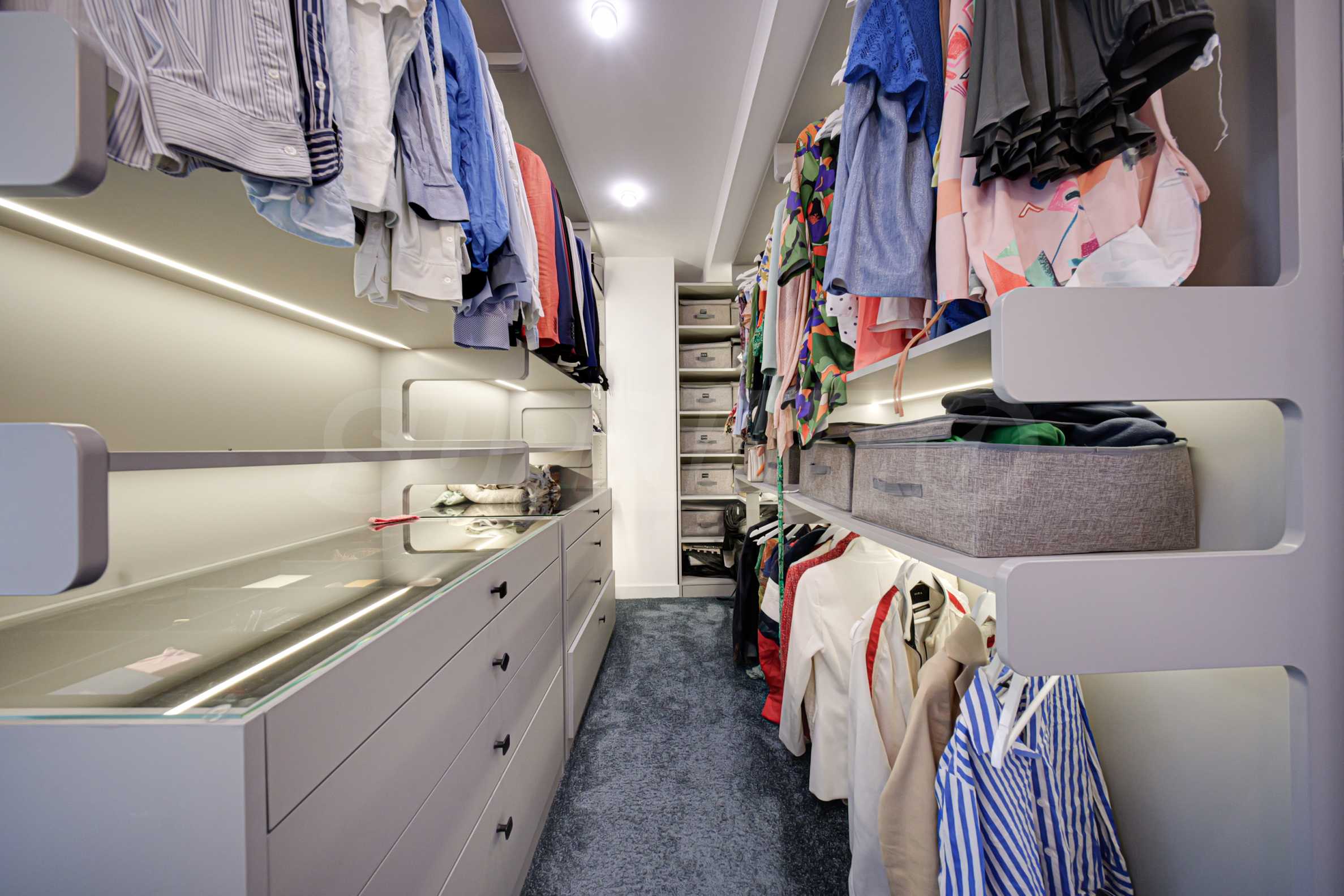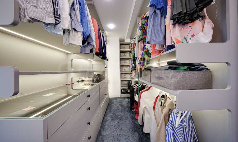 • master bedroom with a dressing room and a view of the lake;