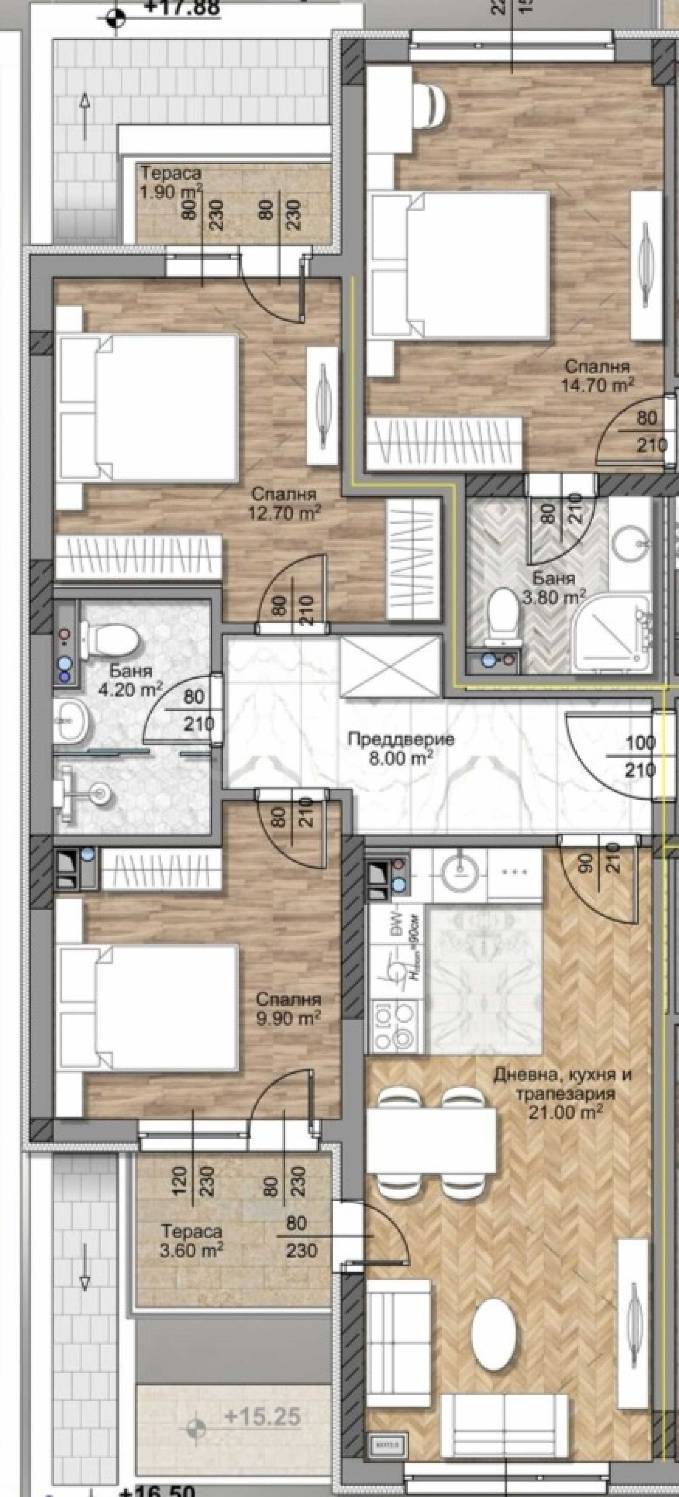 We present an apartment in a newly built residential building located near the New Bulgarian University and the "Mizia" metro station, a modern residential project that promises to become an attractive place to live for people of different ages and with different needs.