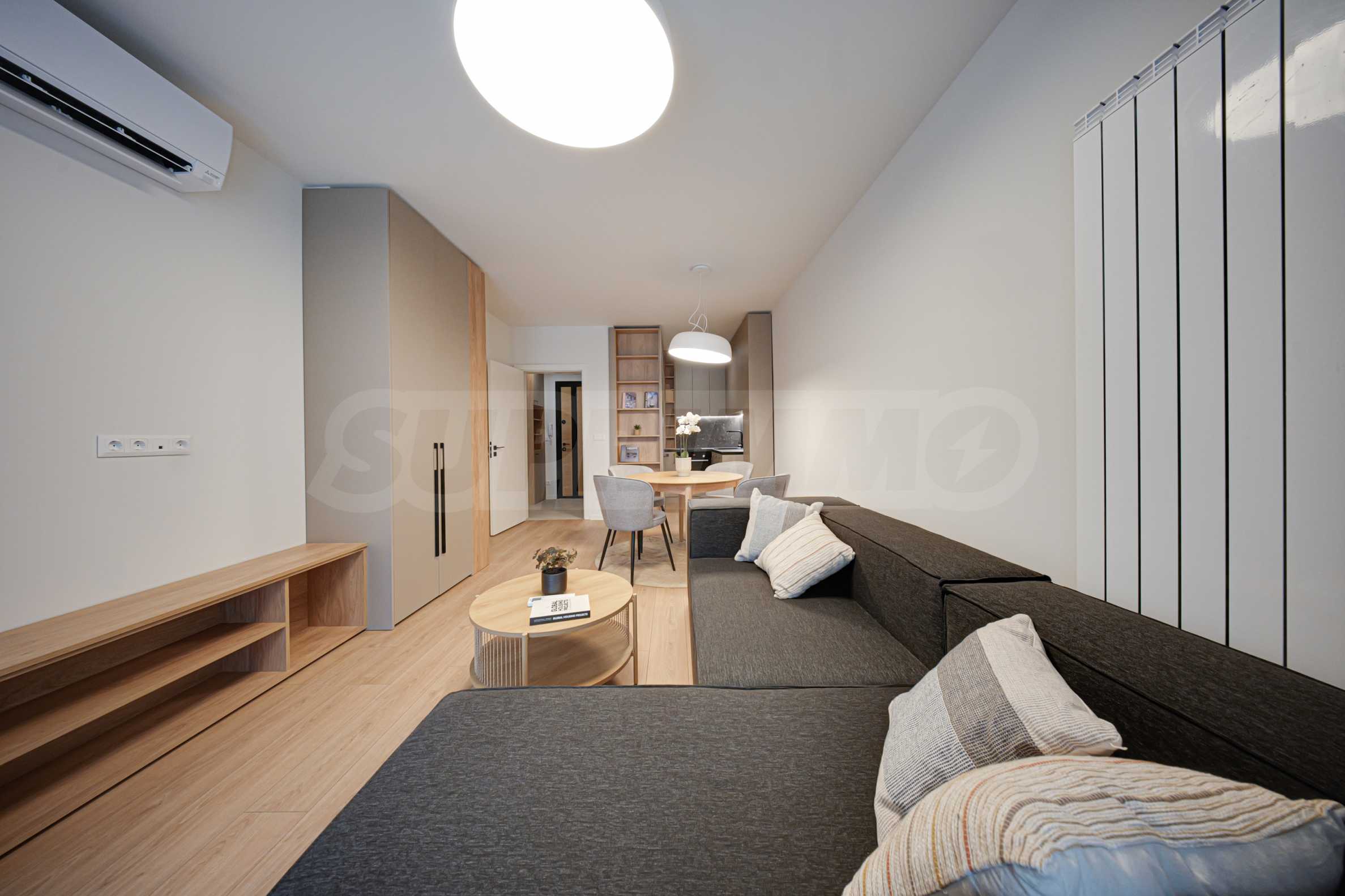 The apartment is fully furnished and equipped with everything you need for a cozy and comfortable life. It consists of a modern living room with a kitchenette and a dining area, where you can enjoy the pleasant view of the garden.