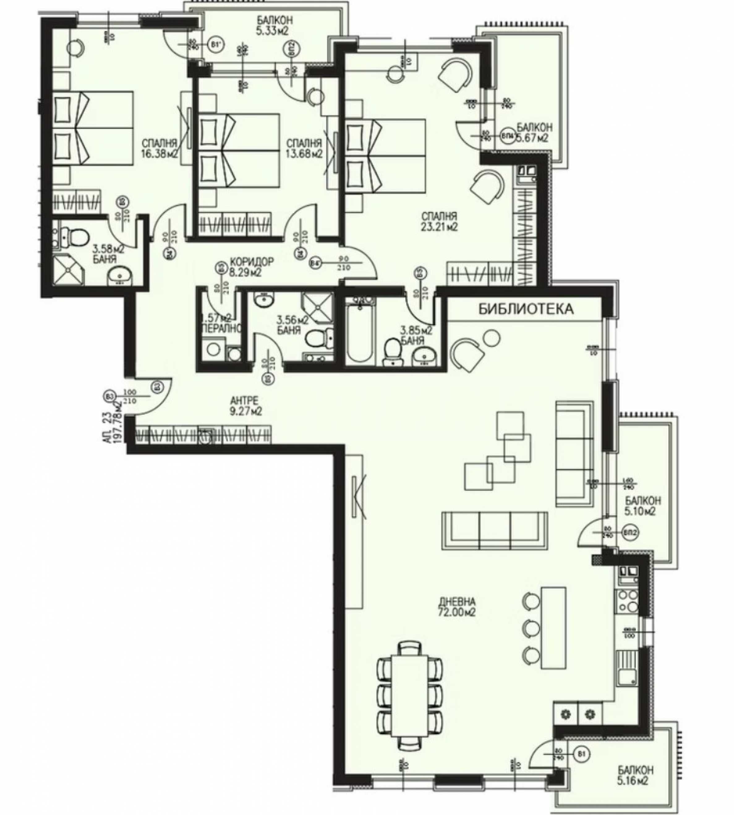 We present a new four-bedroom apartment in a newly built boutique building with a prestigious location, namely in the preferred area - "Dragalevtsi", at the foot of Vitosha Mountain. The building is one minute by car from the Ring Road and close to a future metro station, as well as Mall Paradise, Fantastico and Lidl supermarkets.