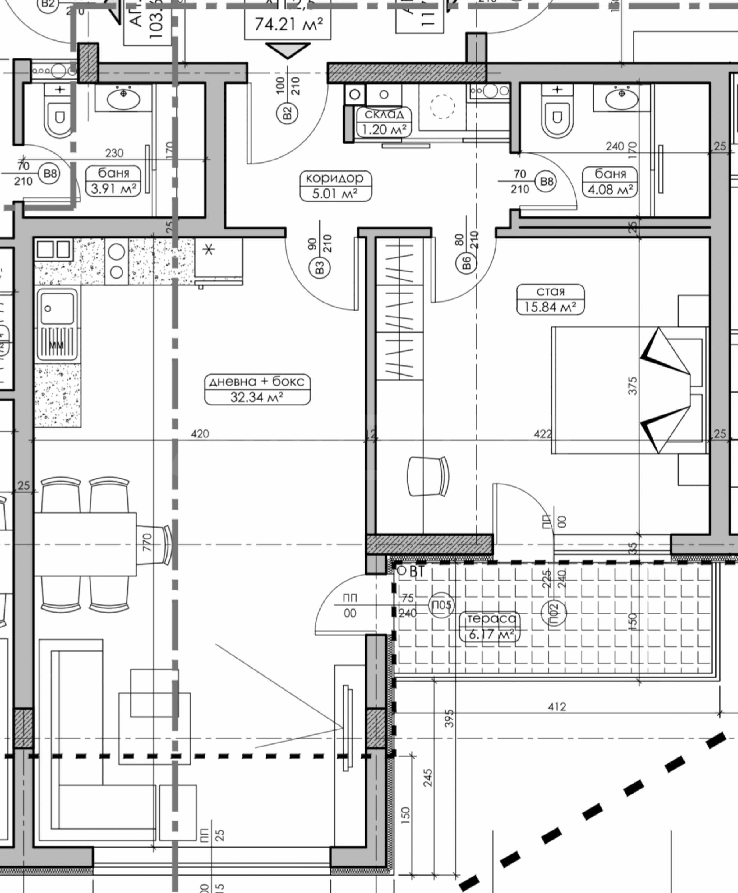 The apartment has a total built-up area of 95 m2., is characterized by functional rooms with a regular shape and the following distribution: