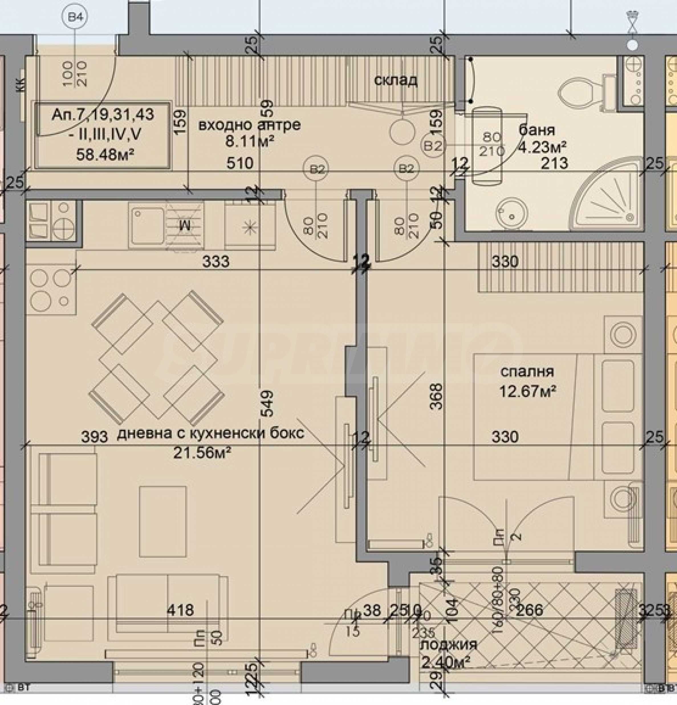 The property is located on the 2nd floor and has a total area of 70.87 m2. It is offered in a state of completion according to Bulgarian Standards. It consists of an entrance hall, storage room, living room with kitchenette, bedroom, bathroom with toilet, loggia.