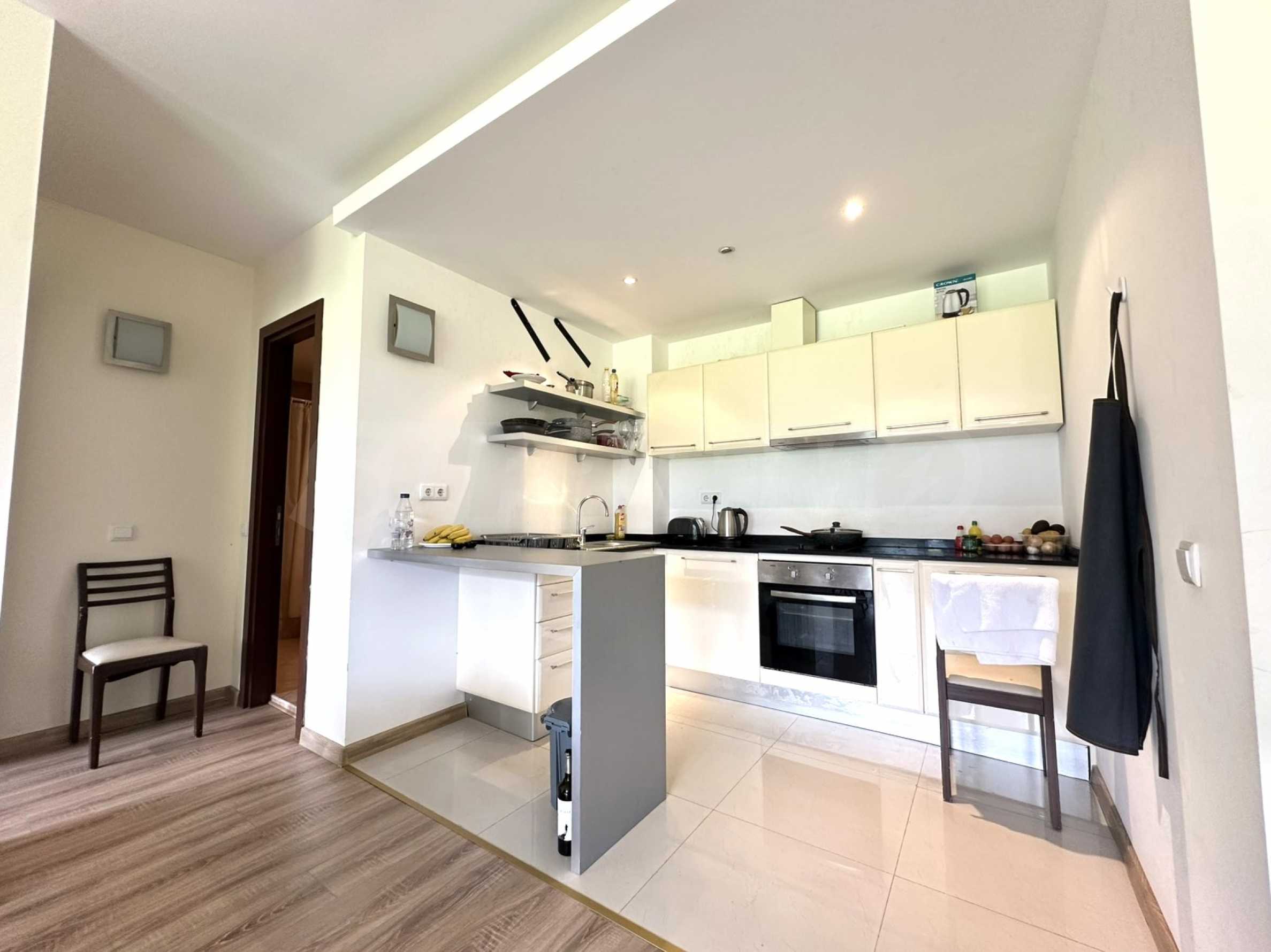 The apartment is fully furnished and equipped for living: