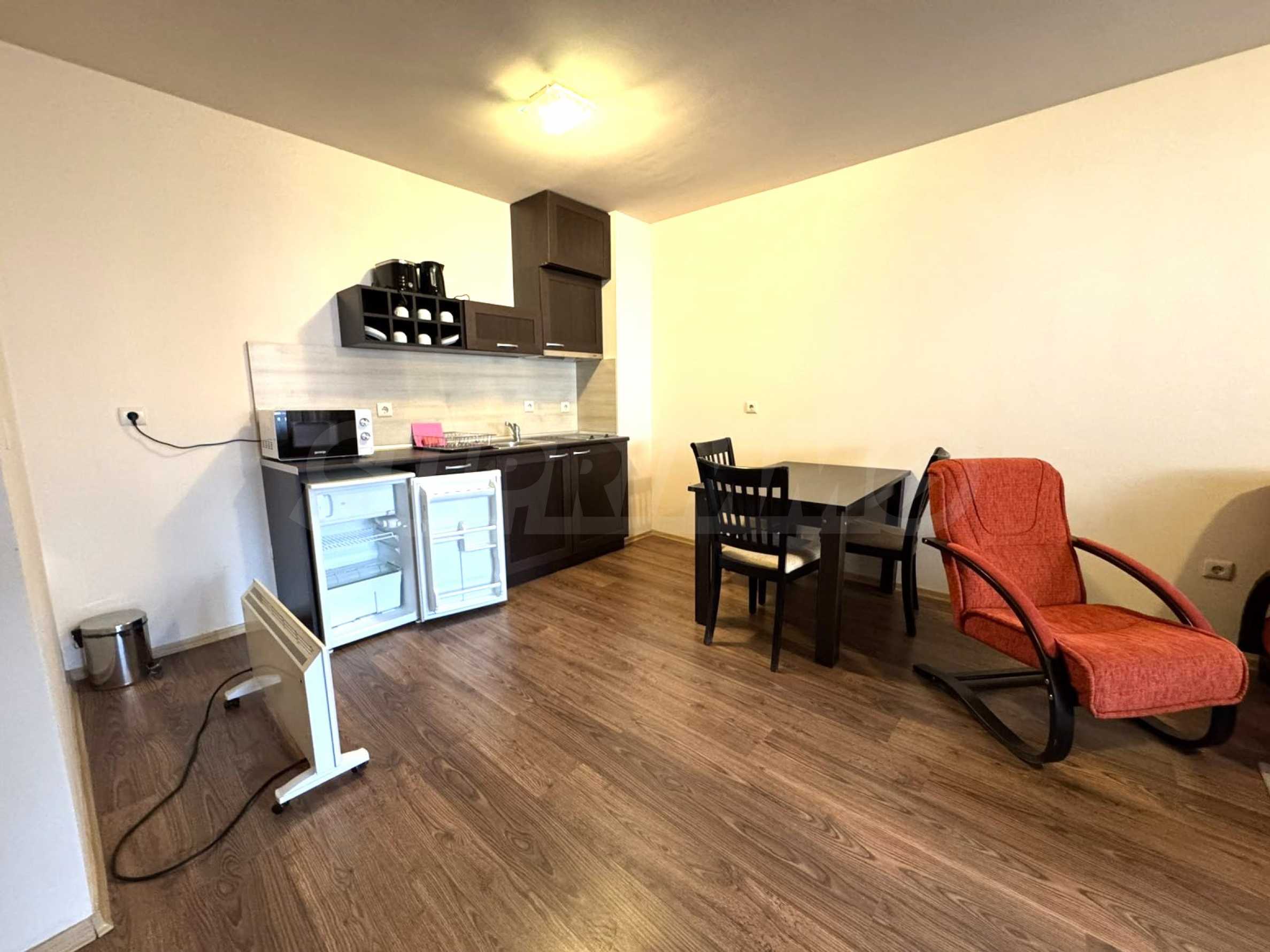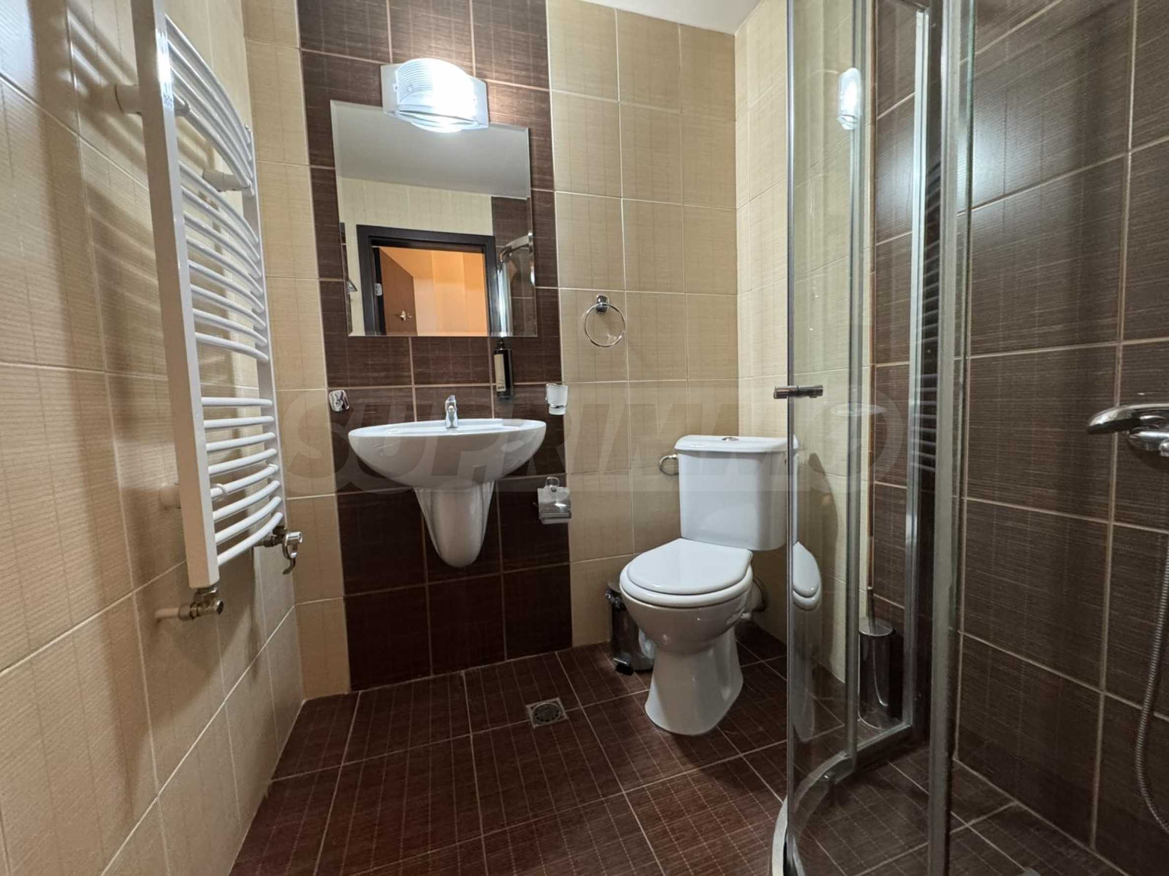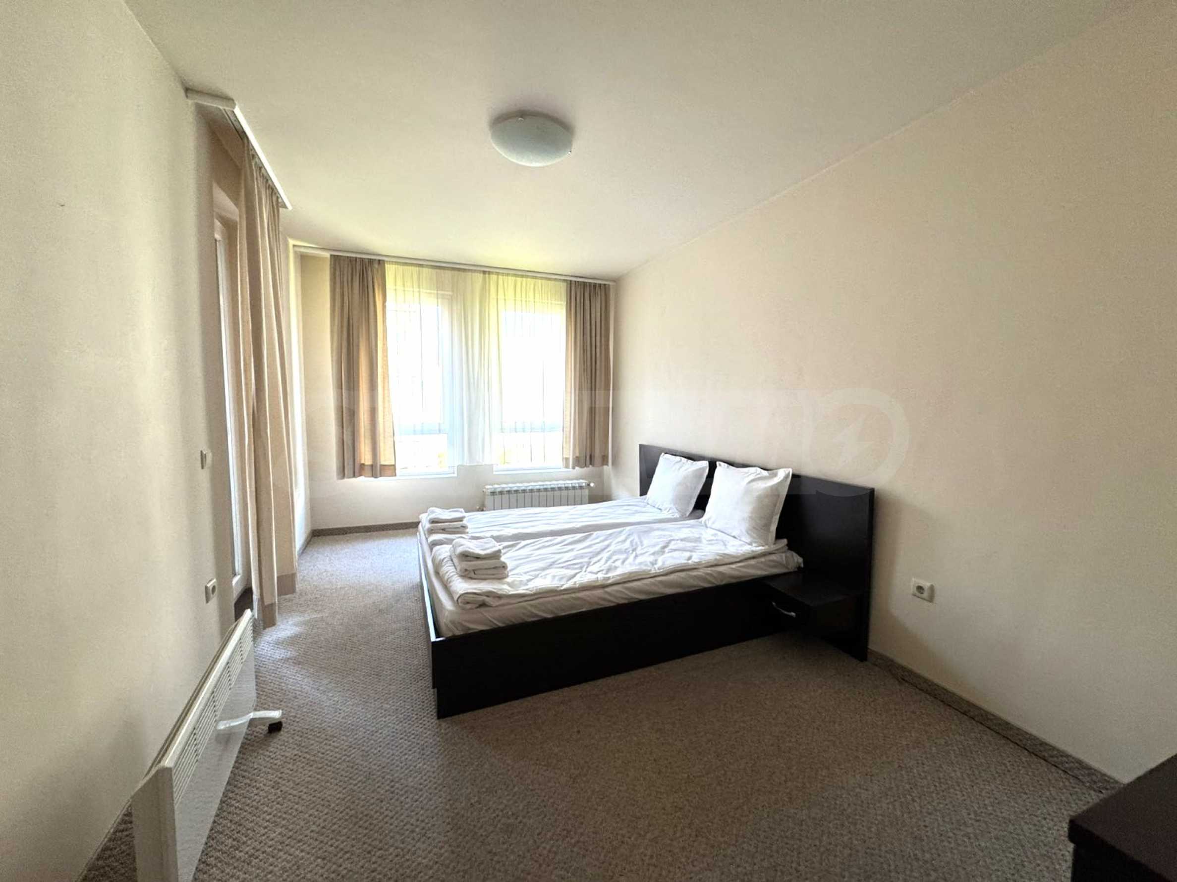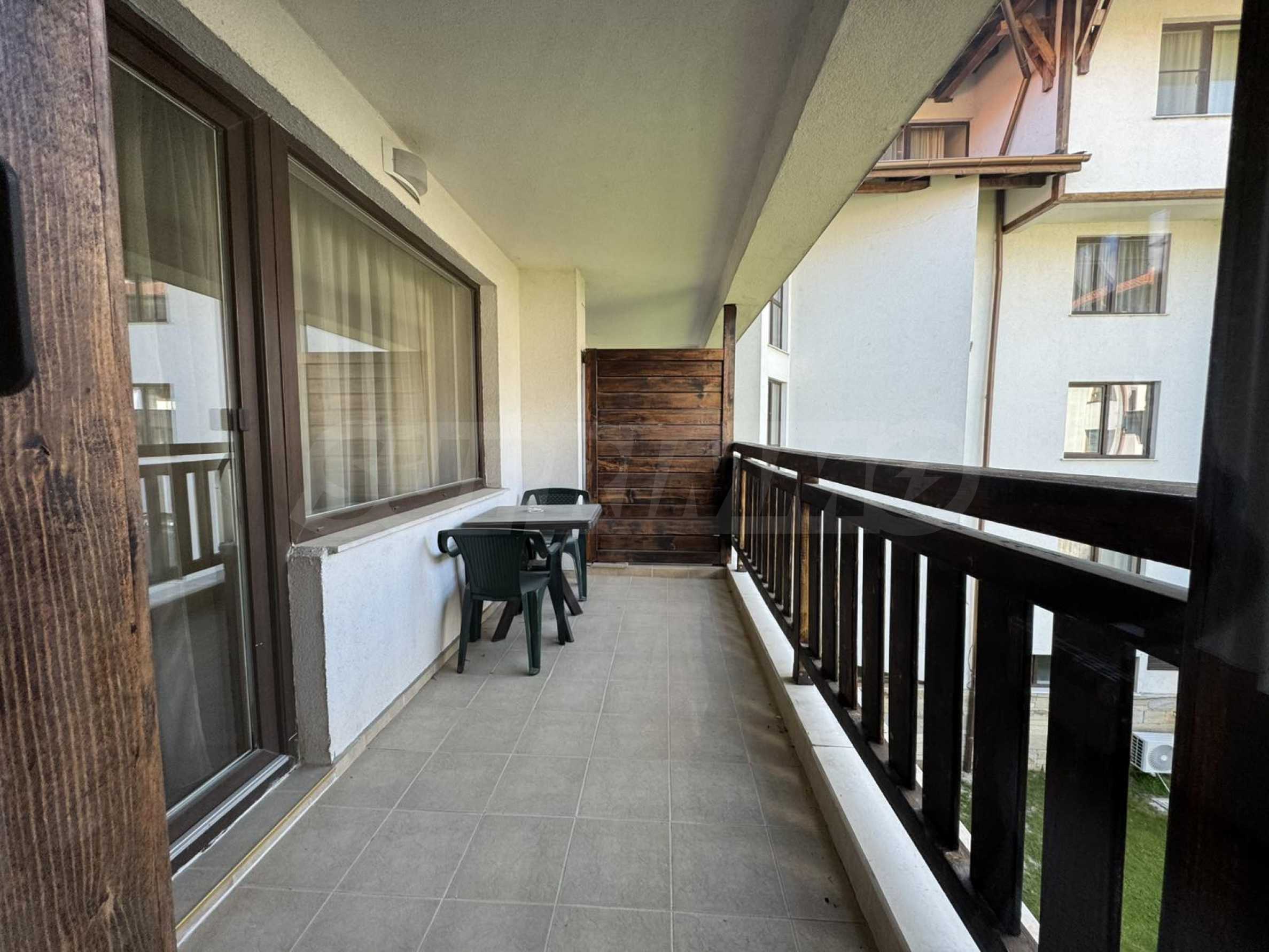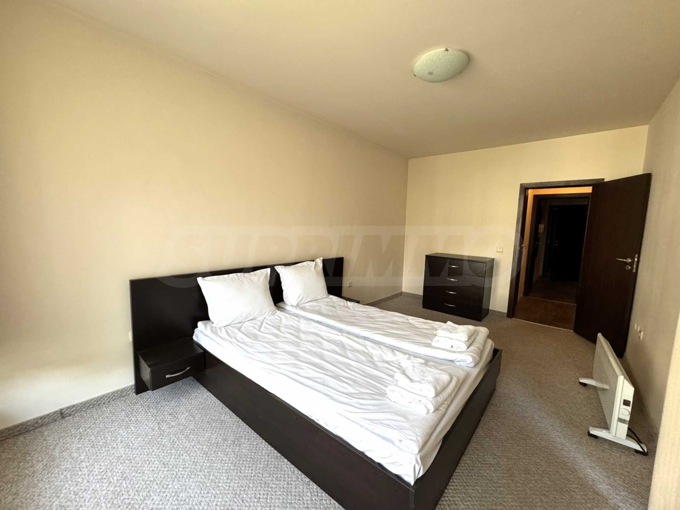 A wonderful offer from the real estate market - sale of a completely south-facing one-bedroom apartment with magnificent views of the Pirin Mountain and the slopes in the gated complex Bansko Royal Towers with a 5,000 m2 meadow with a children's playground and an outdoor pool, 100 meters from the gondola lift.