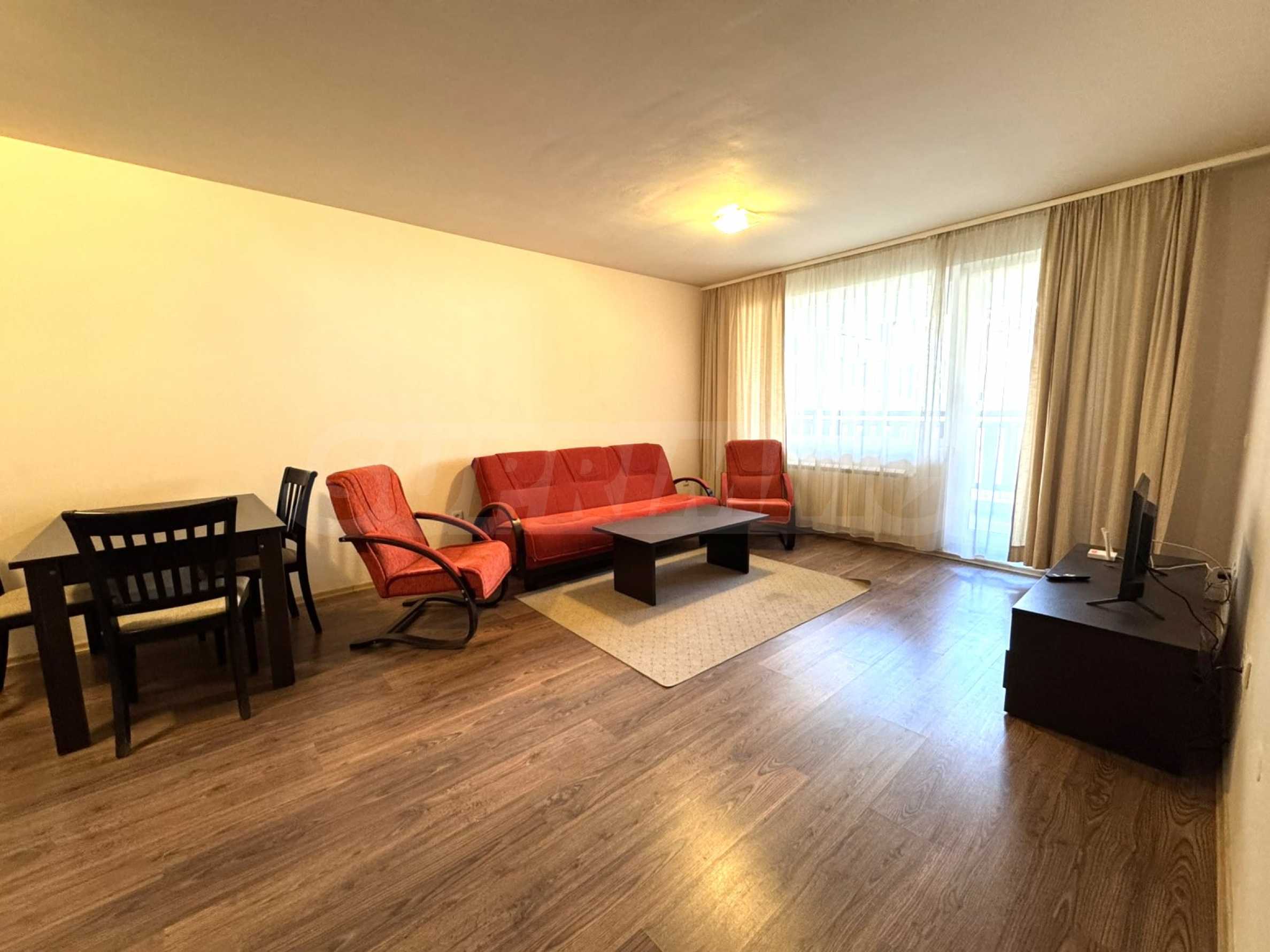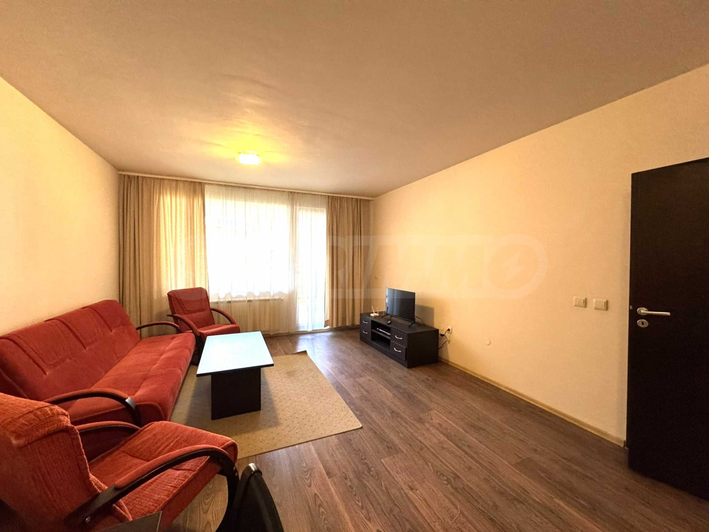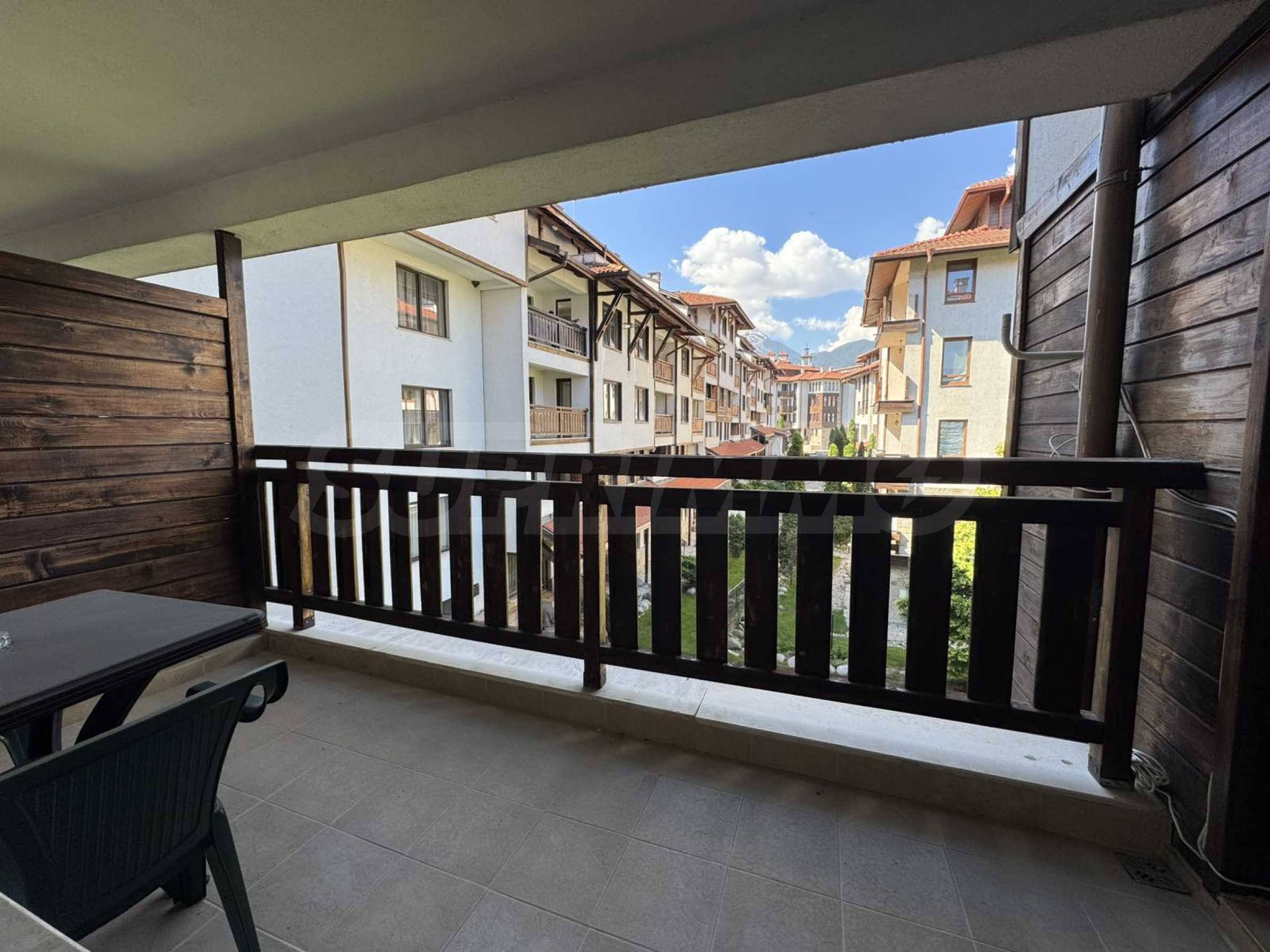 spacious living room with sofas, TV and balcony overlooking the inner courtyard and Pirin Mountain;