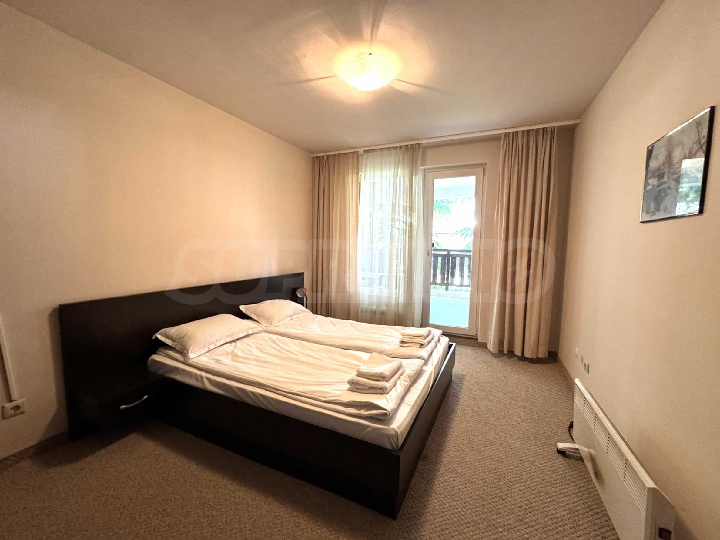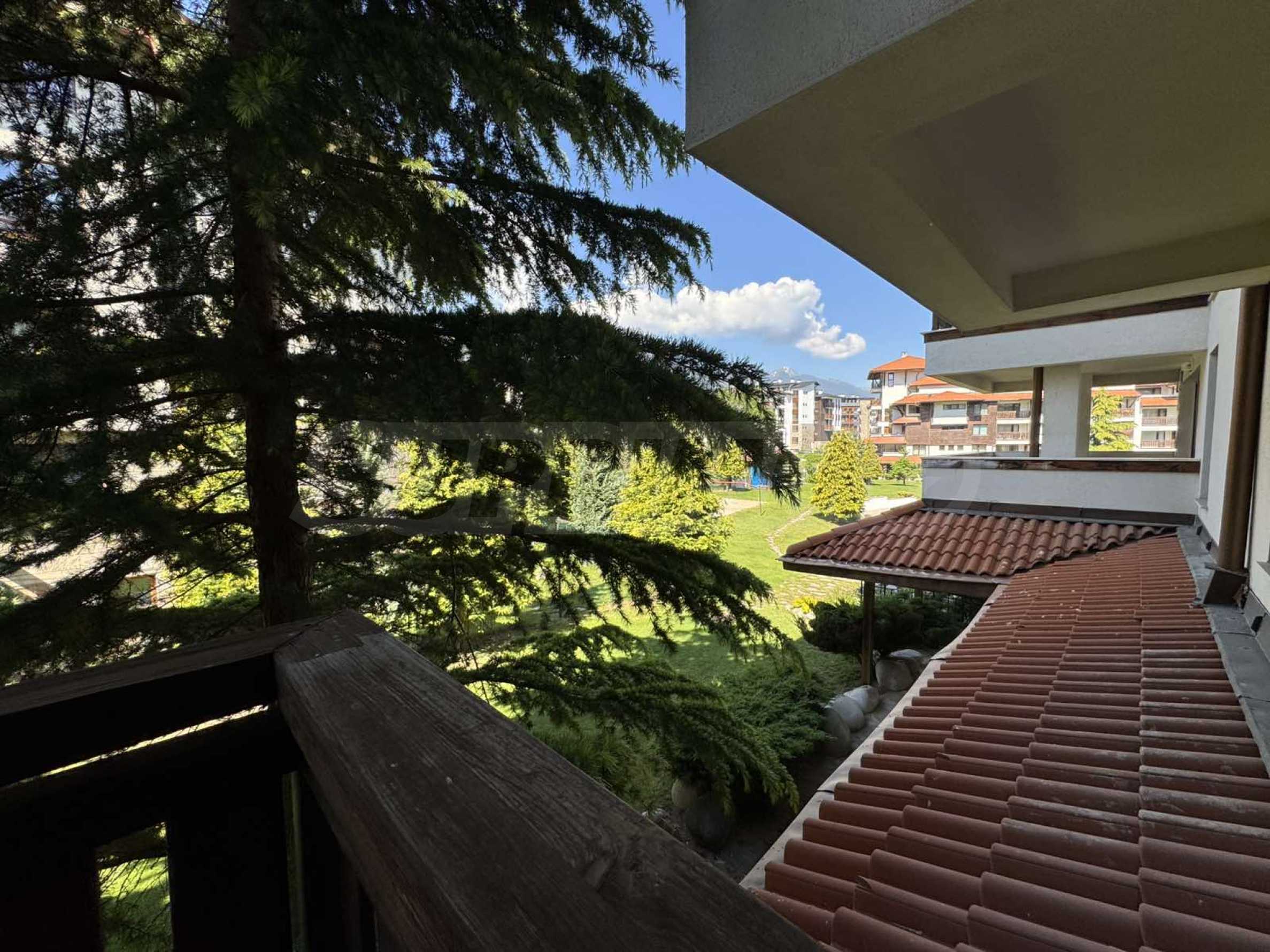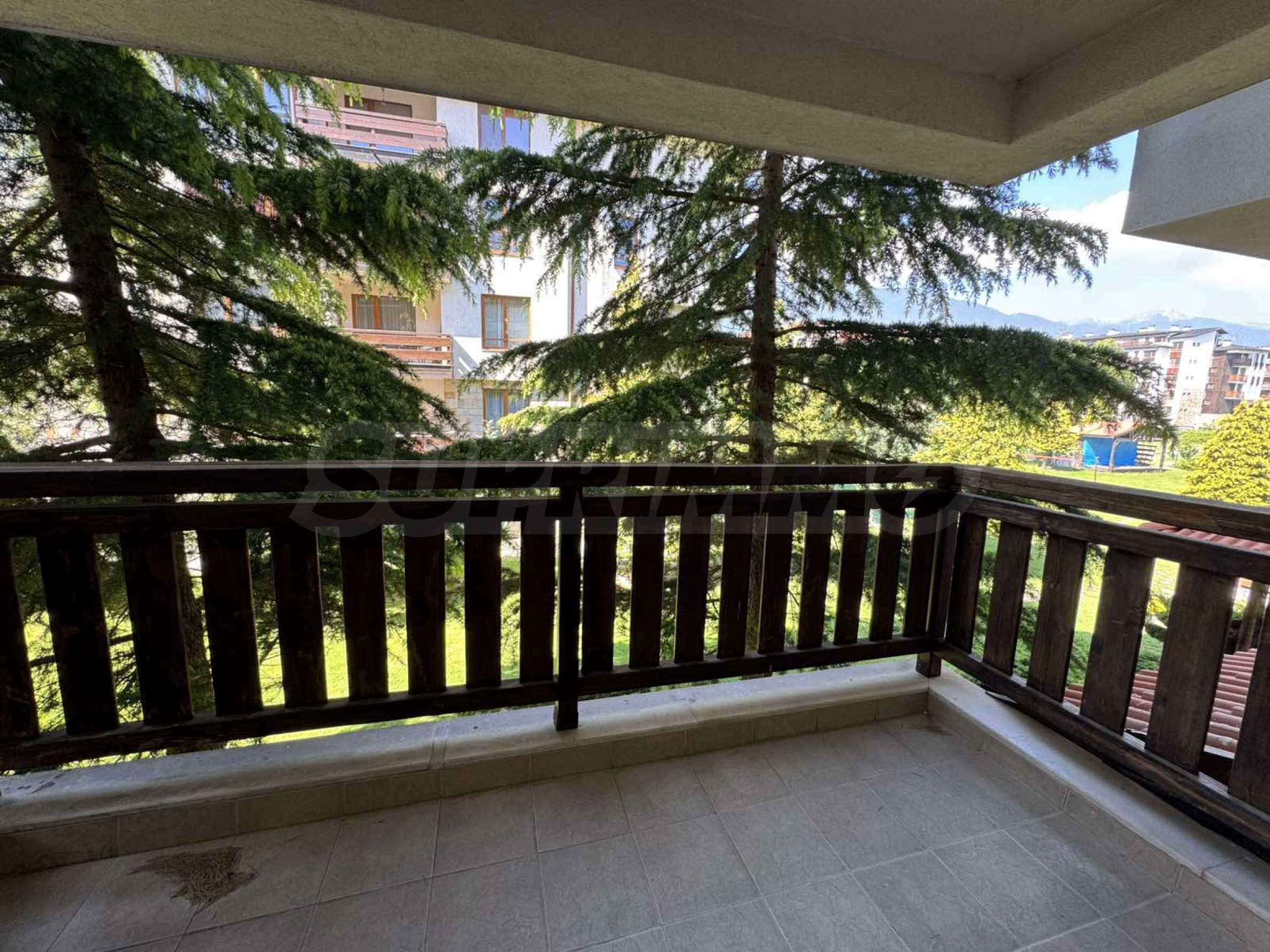 A wonderful offer from the real estate market - sale of a completely south-facing one-bedroom apartment with magnificent views of the Pirin Mountain and the slopes in the gated complex Bansko Royal Towers with a 5,000 m2 meadow with a children's playground and an outdoor pool, 100 meters from the gondola lift.