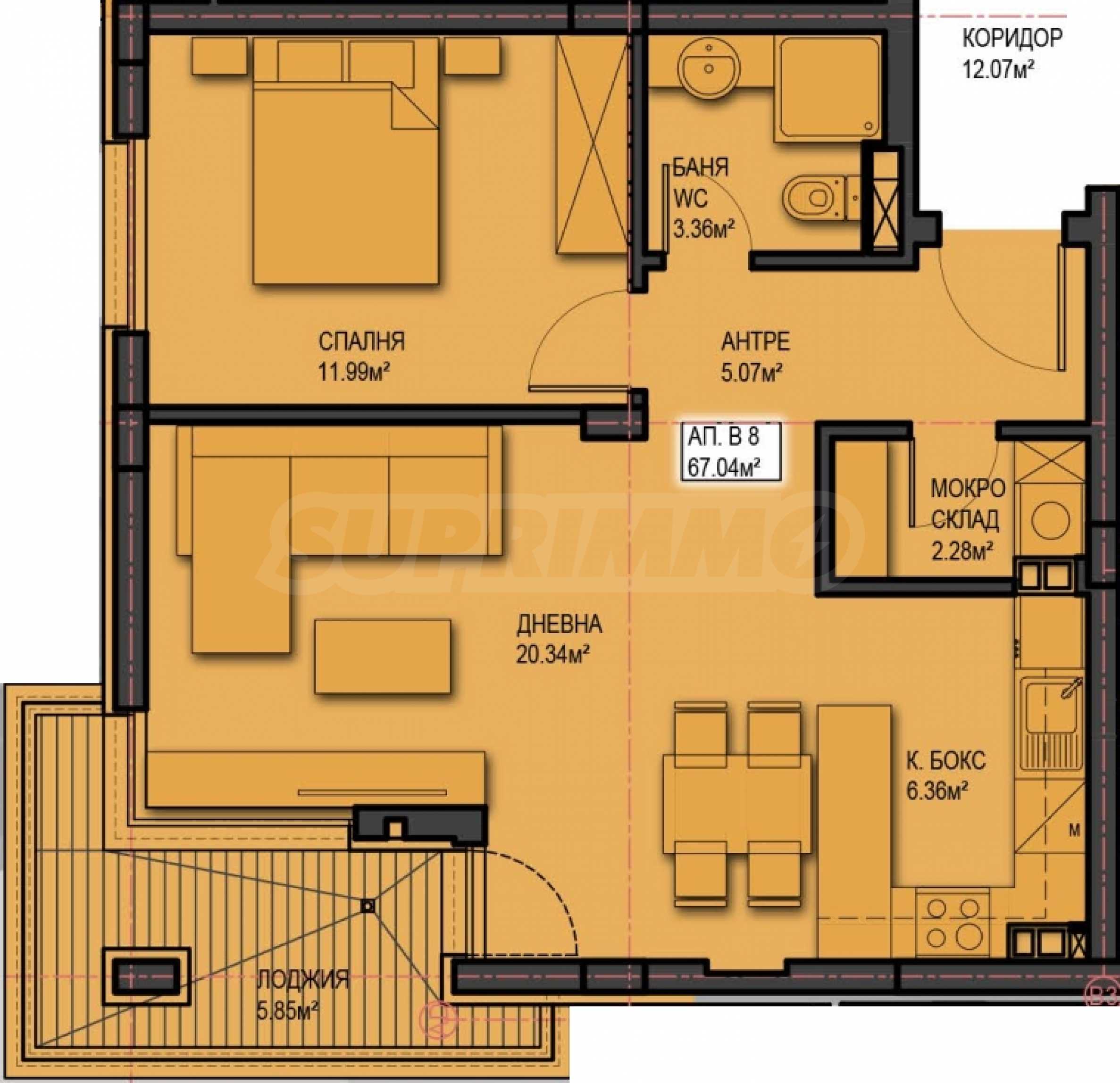 The apartment is located on the 3rd floor of an eight-story building in a gated complex, located in one of the most preferred and dynamically developing areas of Sofia - next to Business Park Sofia, a metro station and the Ring Road. The location provides excellent connections to the main roads of the city.