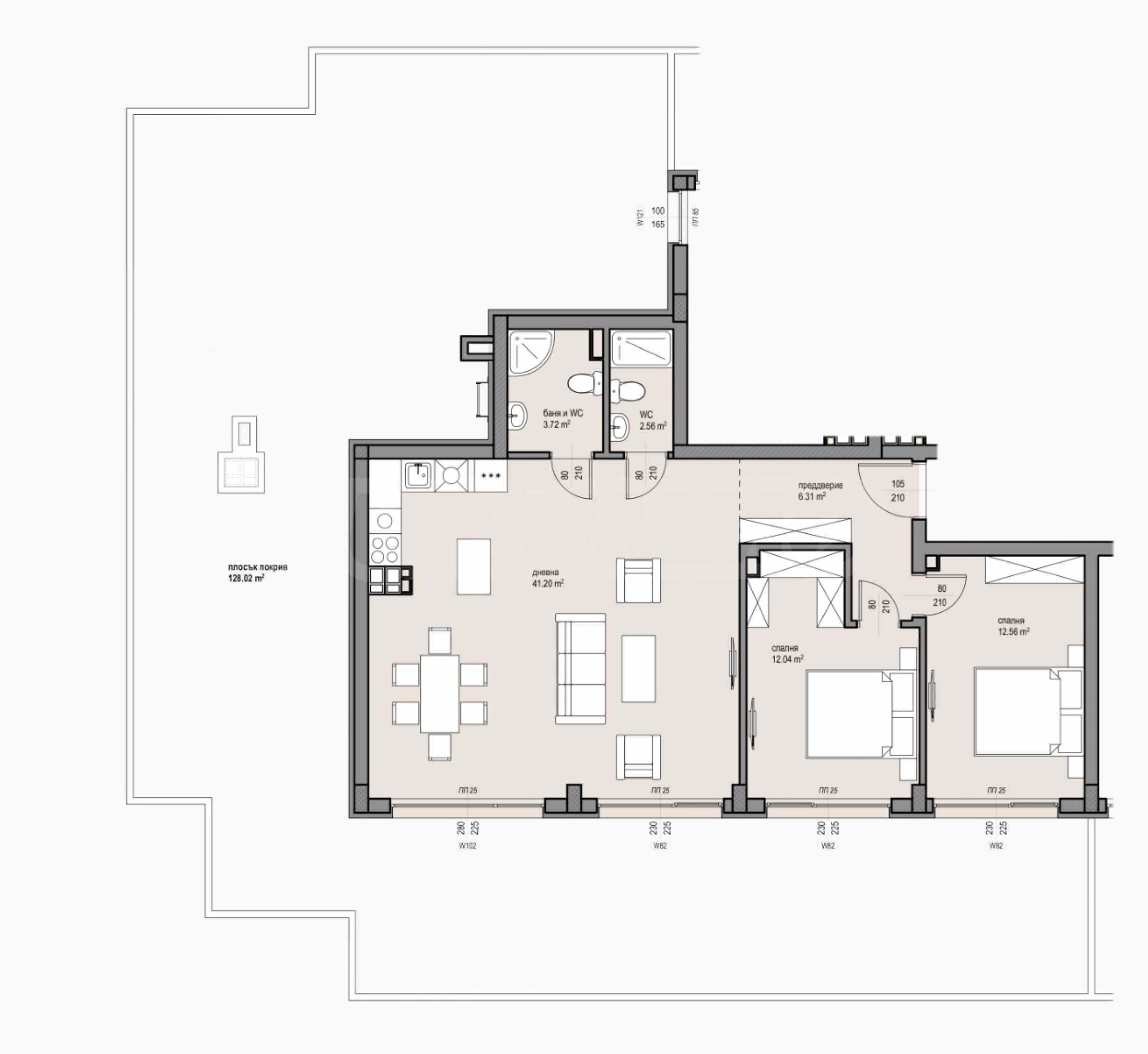 I present to you a three-room apartment in a newly built building in Malinova Dolina district. The building is designed with your comfort in mind. The apartment has a net area of 244 sq m, reaching 267 sq m with the common areas and a separate roof terrace of 128.02 sq m. The distribution is as follows: living room with kitchenette, two bedrooms, hallway and two bathrooms with toilets. The exposure is southern. The price is 320,000 euros including VAT, and the payment schemes are individual.