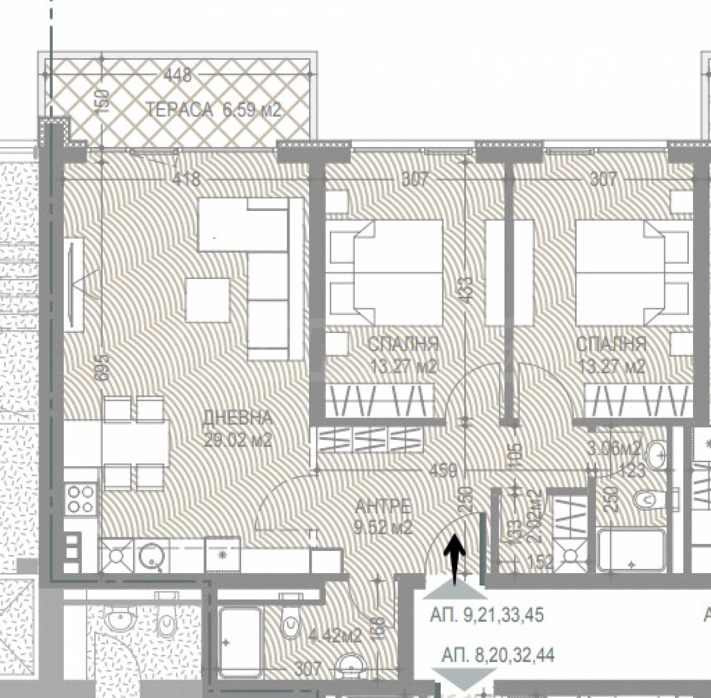 The apartment is located on the 1st floor and consists of an entrance hall, two bathrooms with toilets, a utility room, a living room with a kitchen and a terrace, two bedrooms. The property has a total area of 123.22 m2., with a storage room of 3.45 m2.