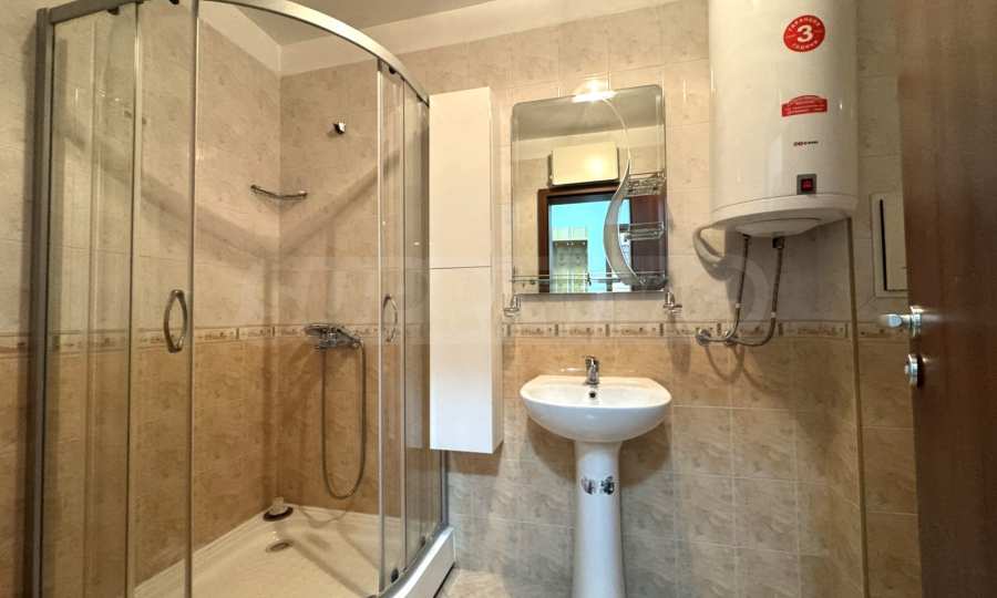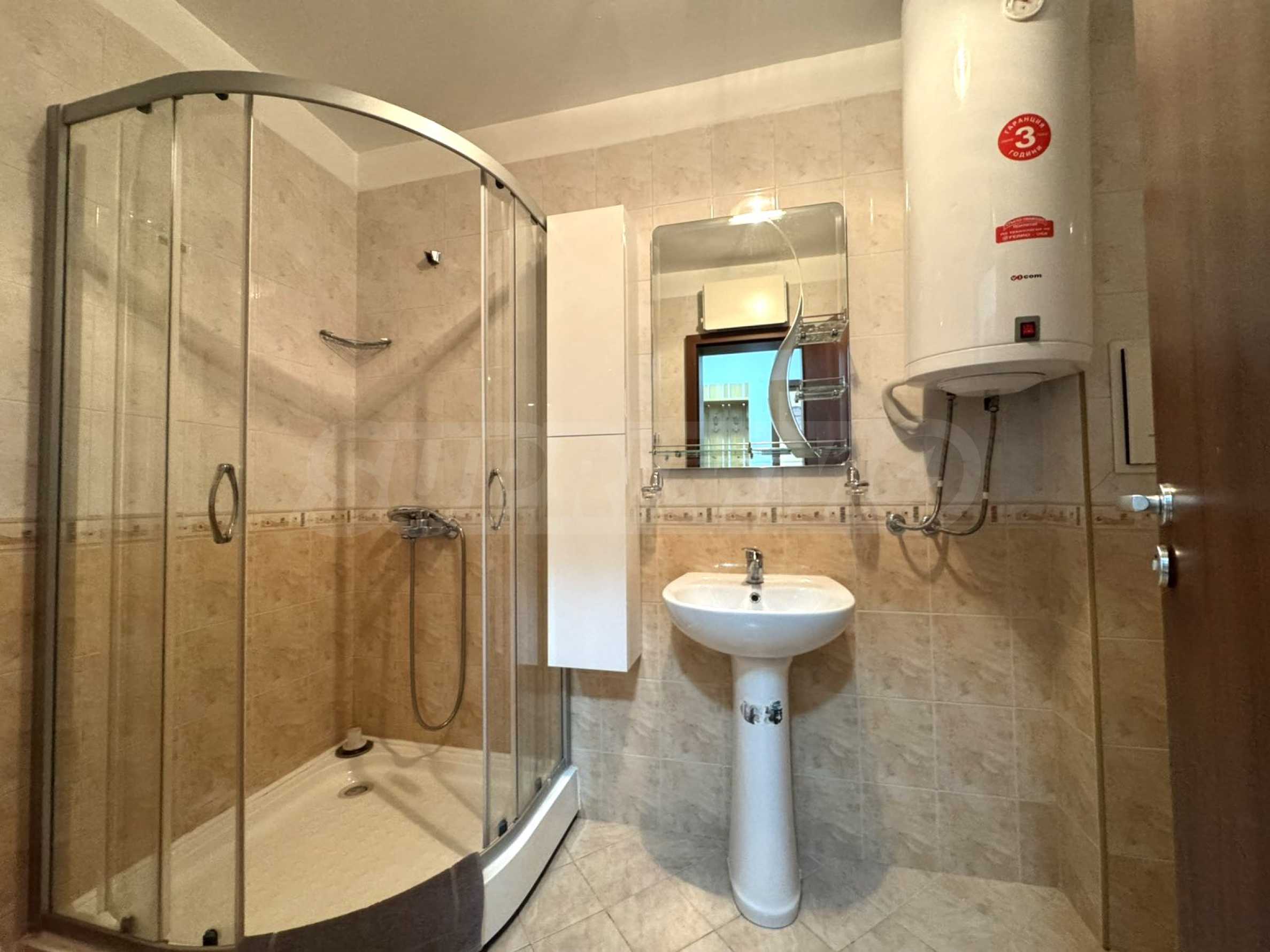 • Bathroom with shower cabin, toilet, sink and water heater.