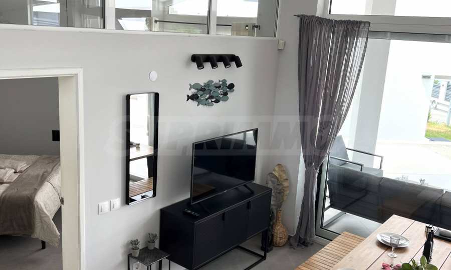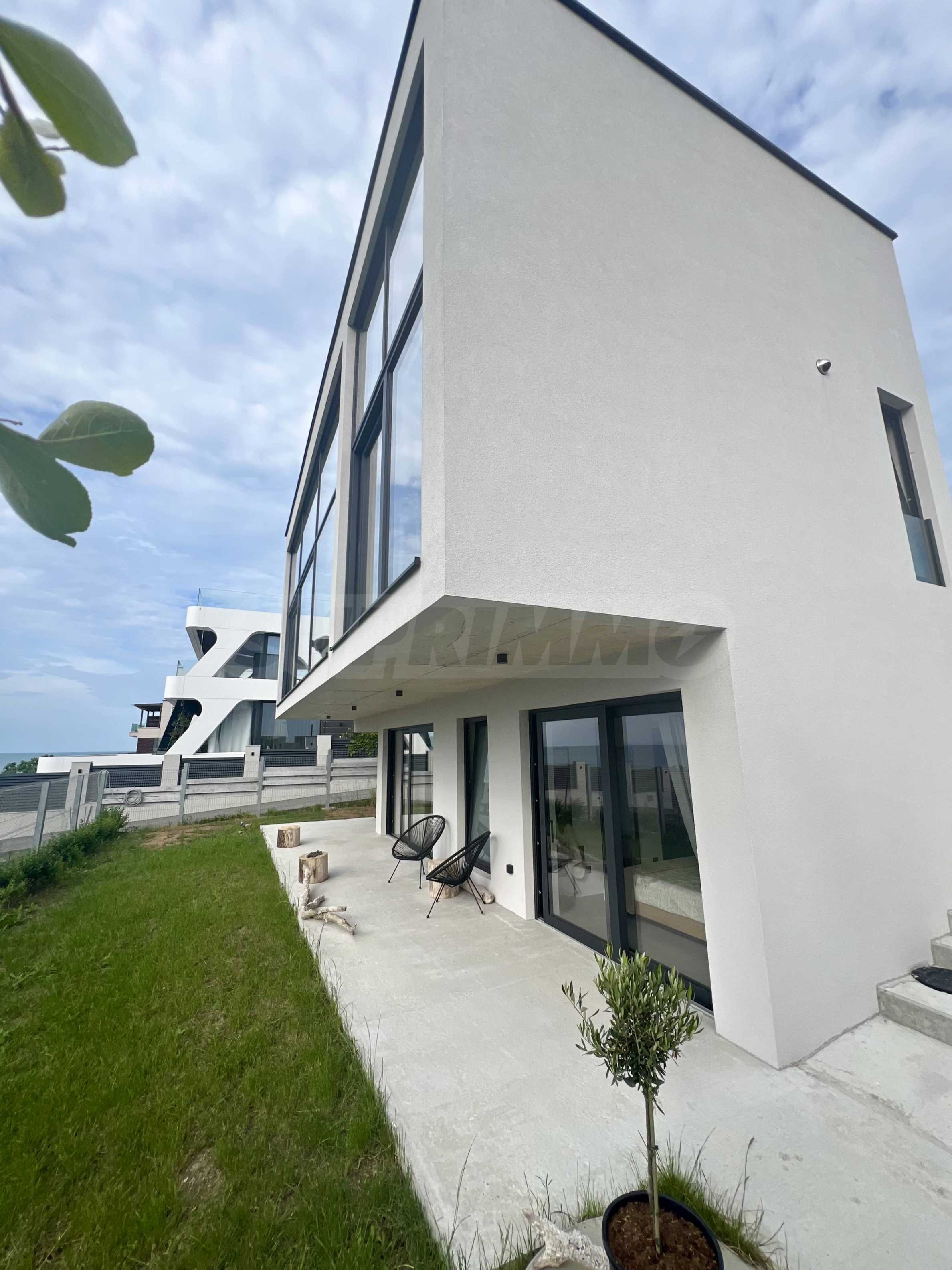 The first-class building with an ultra-modern look and attractive panoramic windows has a total area of 128.56 m2, designed on 3 levels with a full view of the sea. The entrance is covered by a platform at an elevation of +3.00, which serves as a visor for protection from sun and rain.