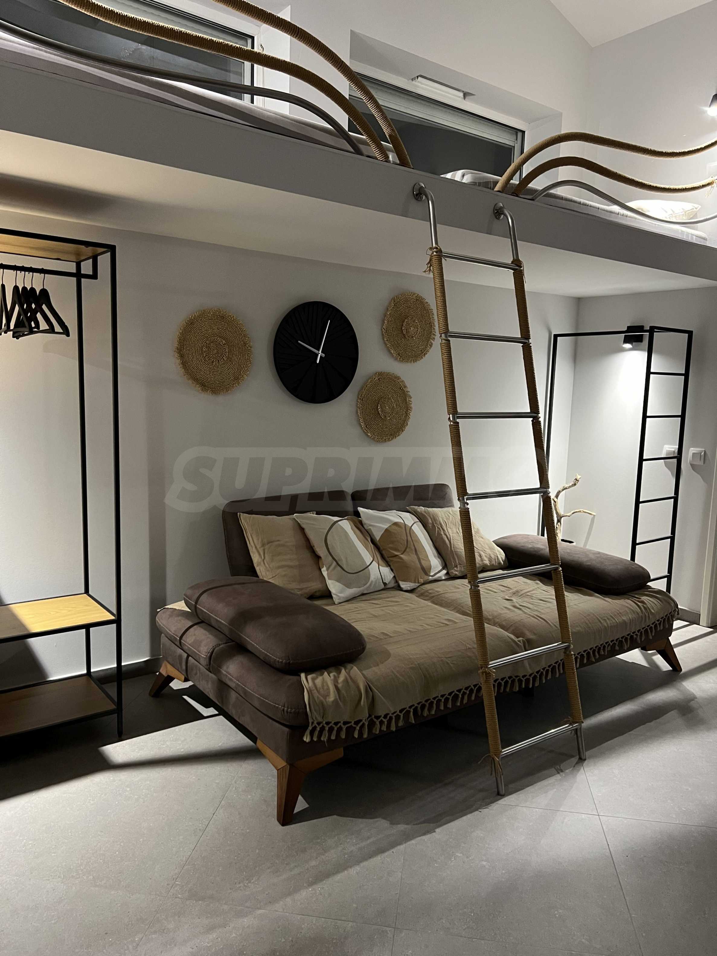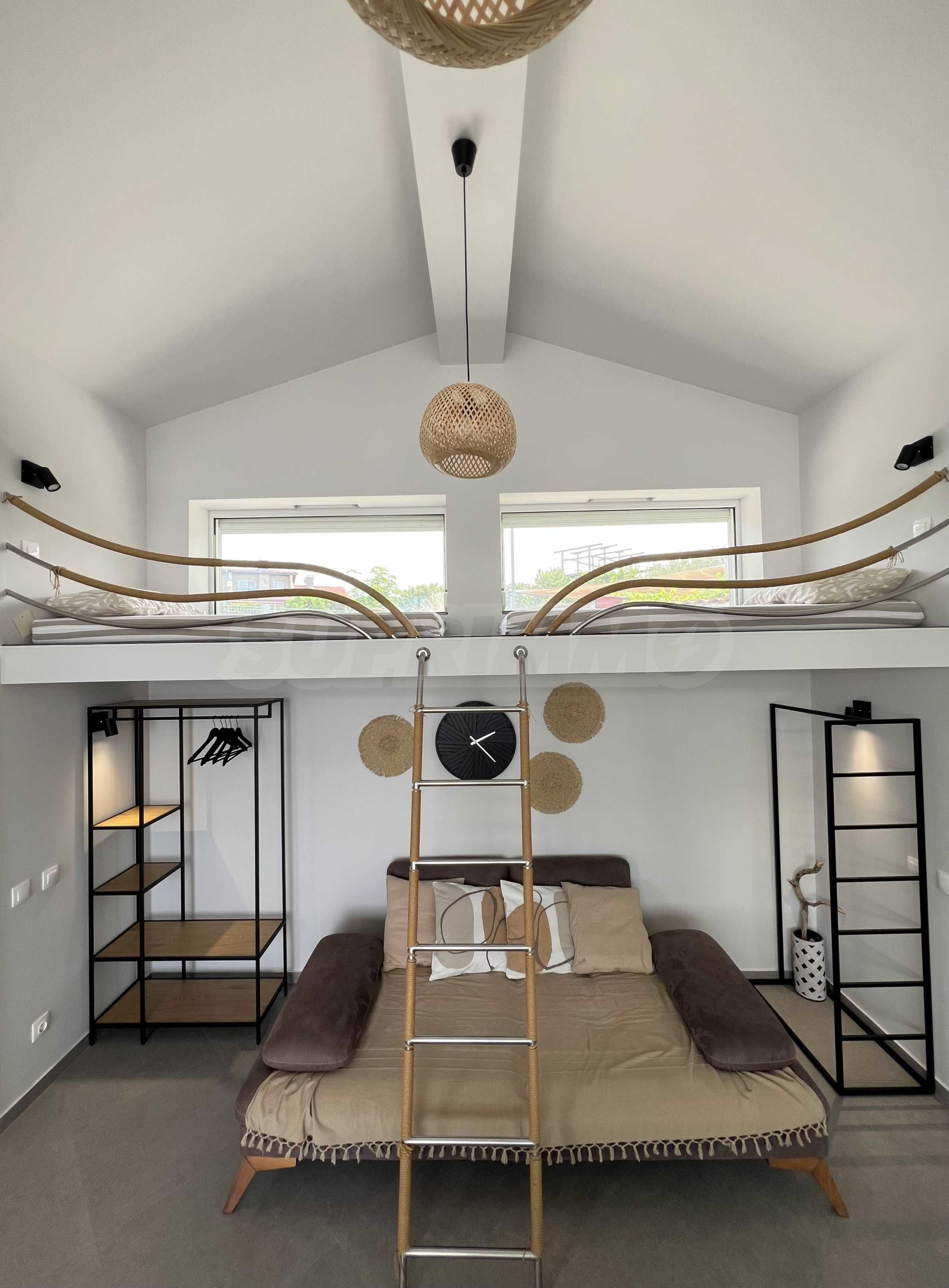 • floor 2: second level: small bedroom open to the living room on the lower level.