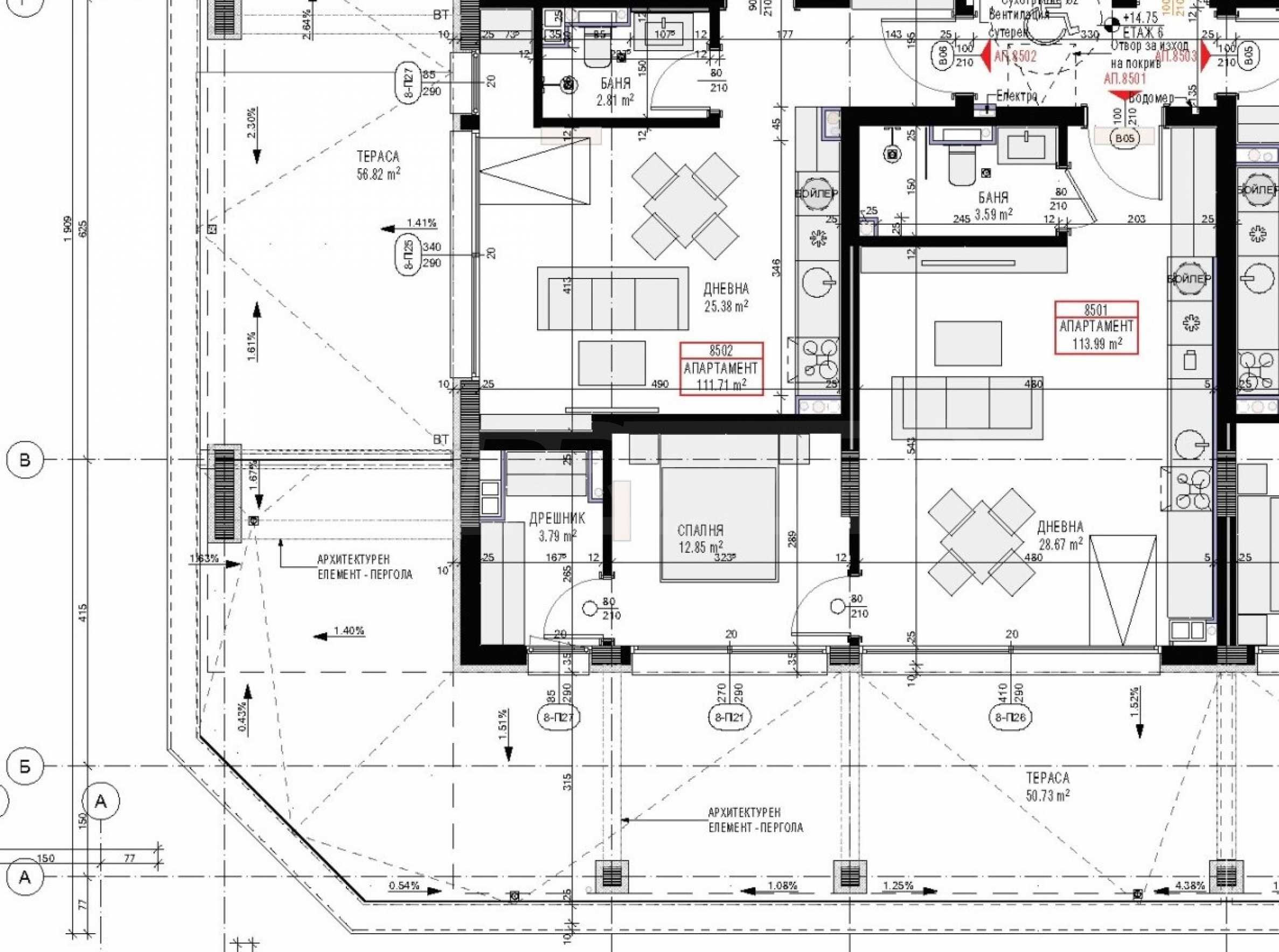 The apartment with a total area of 130.64 sq m is located on the 5th floor of 5, with south/east exposure and a view of the pool, with the following distribution: