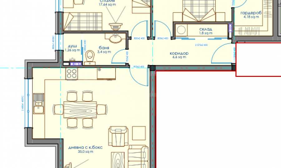 The living room has an area of 35 sq m, the first bedroom has an area of 17.64 sq m, and the second - 14.70 sq m.