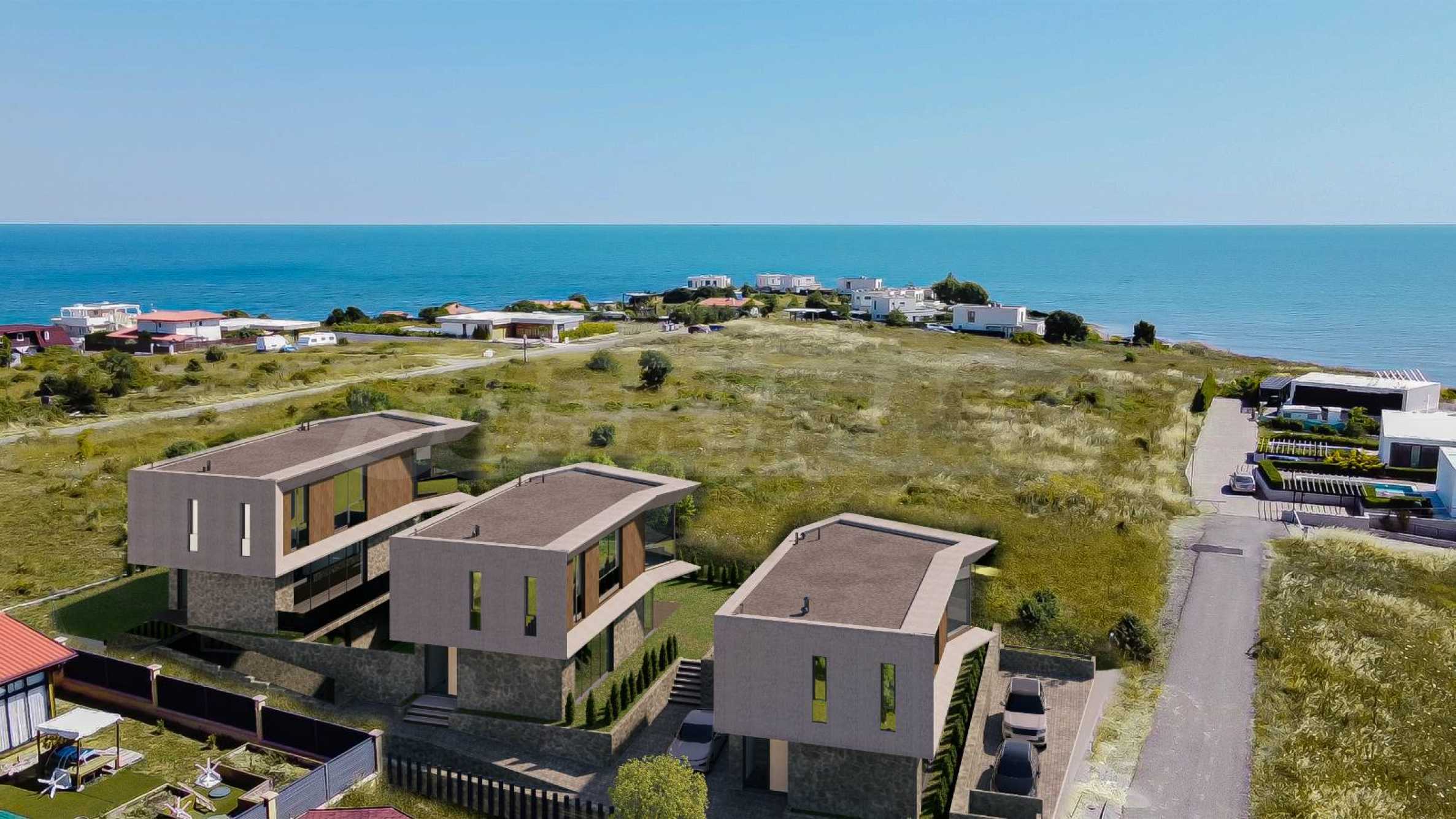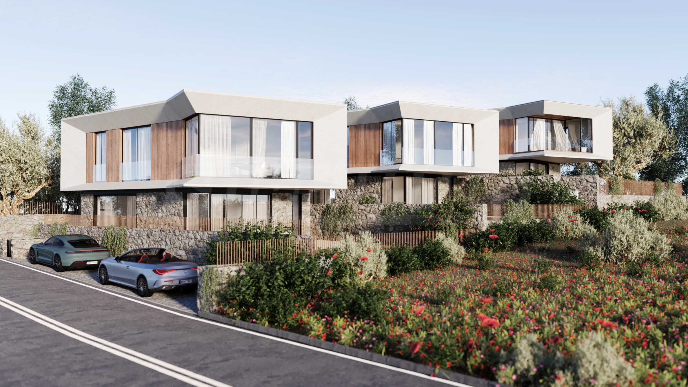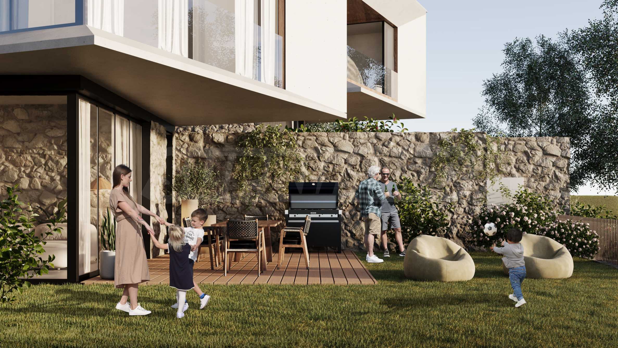 The complex is designed in a contemporary architectural style, with straight lines and futuristic accents. The houses have a modern and functional layout, on two floors, with separate landscaped courtyards.
