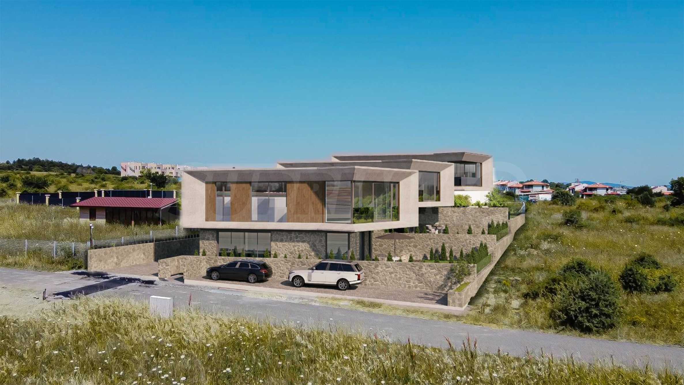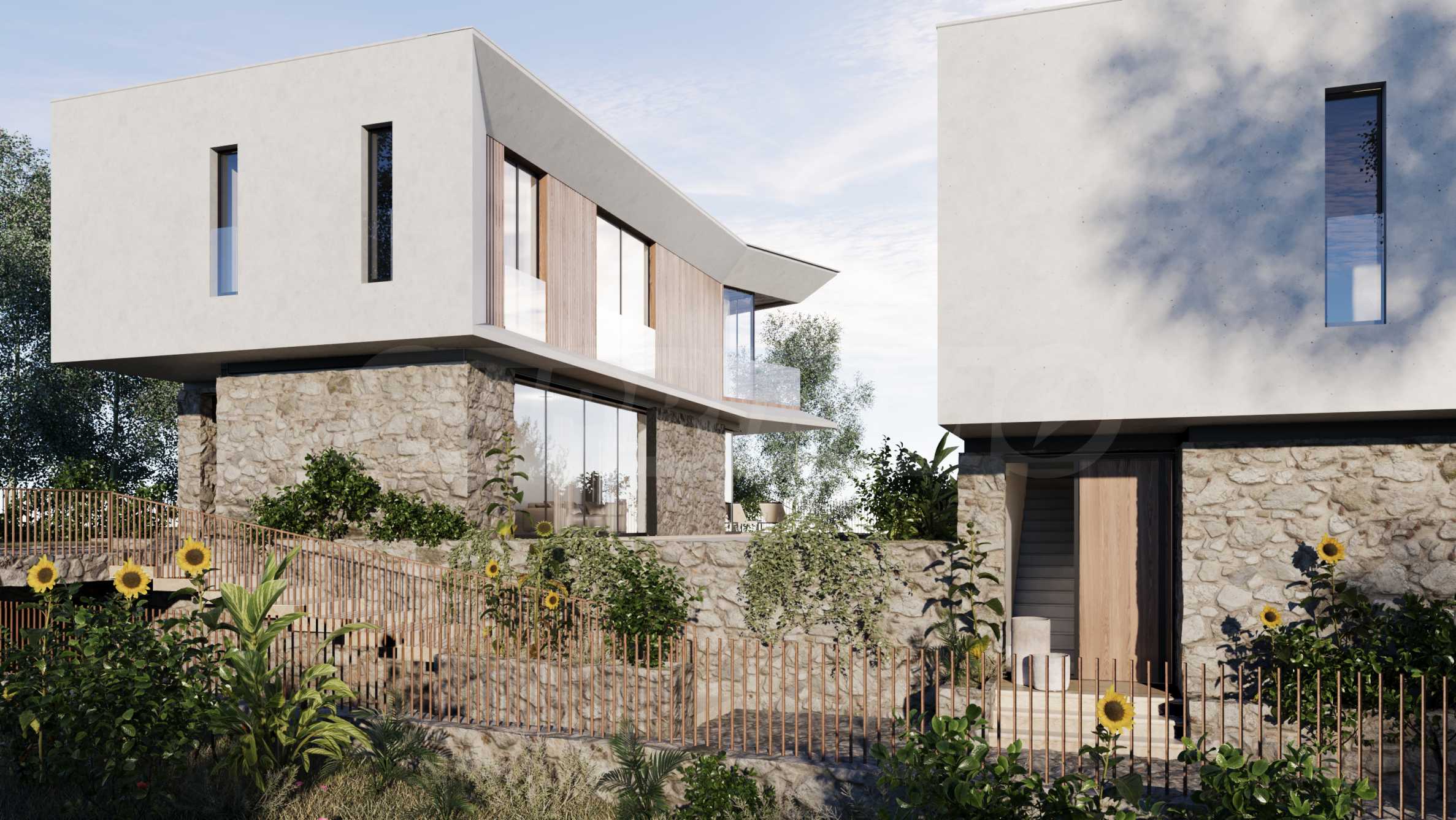 The complex is designed in a contemporary architectural style, with straight lines and futuristic accents. The houses have a modern and functional layout, on two floors, with separate landscaped courtyards.