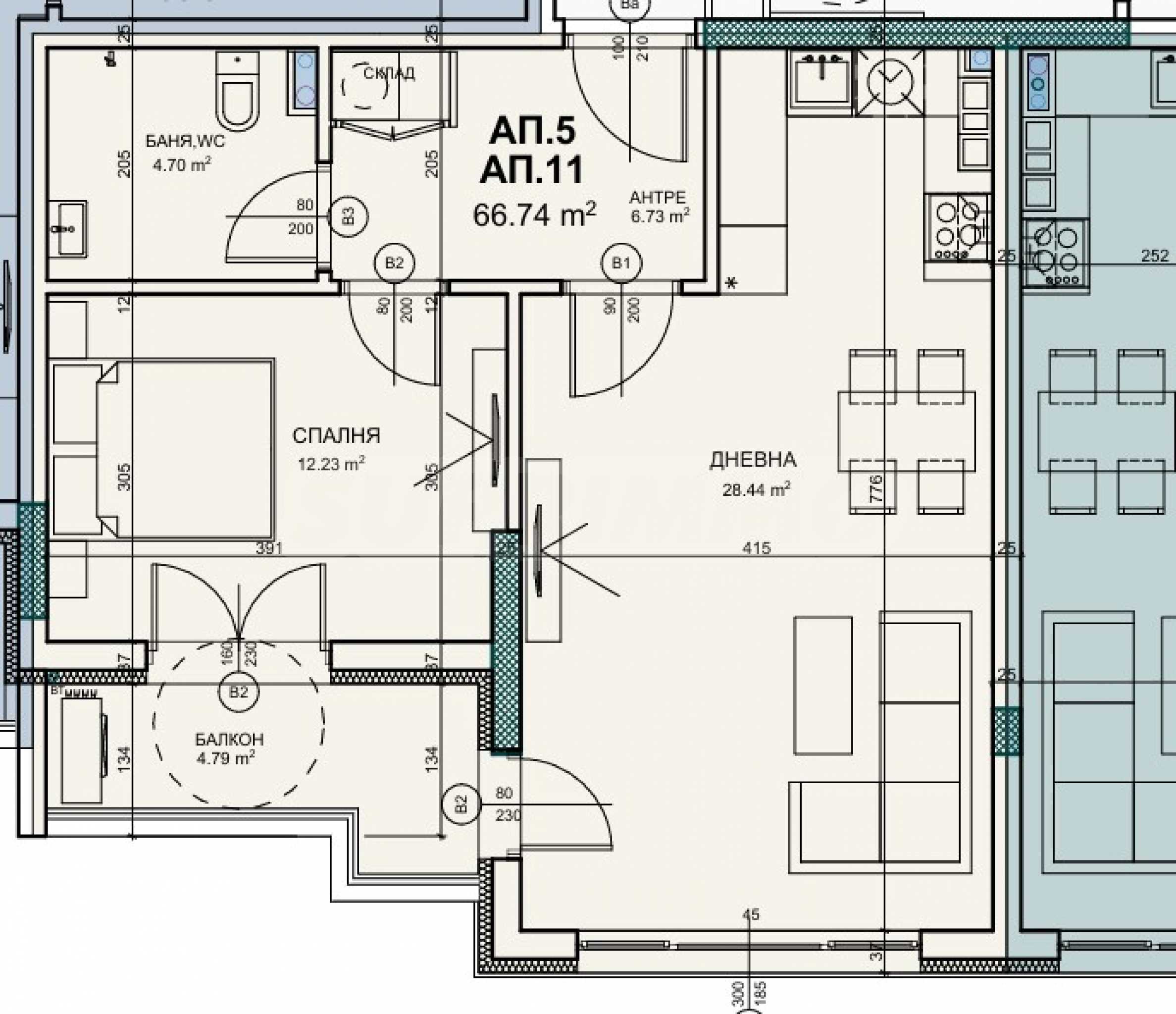 • The electrical distribution installation will be built according to the project and completed in accordance with the Bulgarian Civil Code for issuing a permit for use with separate electrical panels for each apartment, switches and sockets. The materials used for the complete construction of the electrical installation are planned to be Legrand, Schneider Electric or similar from the same price class. The low-current and heat-releasing installation will be built with horizontal distributions on the floor in corrugated pipes before applying the floor screed.