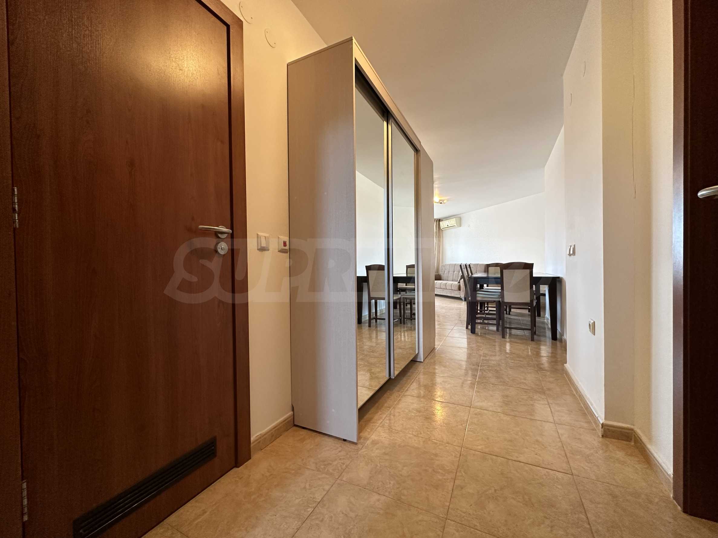 We present a comfortably furnished two-bedroom apartment in the popular seaside complex in the green and quiet part of the town of Sveti Vlas, just 350 meters from the beach. The property is suitable for both personal use and as a profitable investment - the complex is developed in a tourist plan and has all the necessary amenities for seasonal or year-round living. The building is part of a prestigious complex of 3 buildings, with beautiful gardens, a children's playground and swimming pools each.