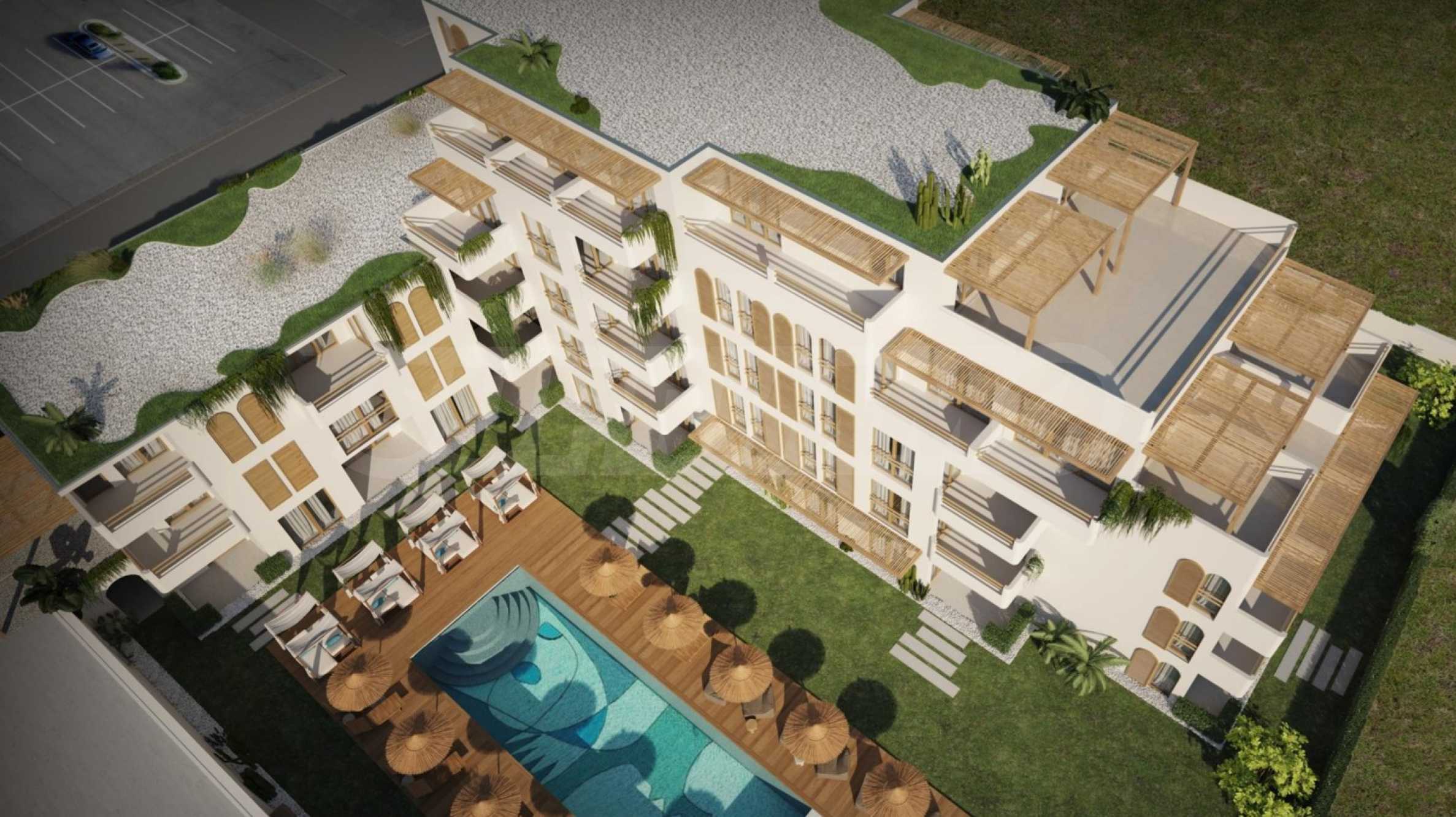 The complex offers a combination of excellent location, modern architecture and uncompromising quality. The landscaping of the territory follows the aesthetics of the boho style - a living composition of cacti, shrubs, exotic trees and decorative elements, creating a true garden of the senses.
