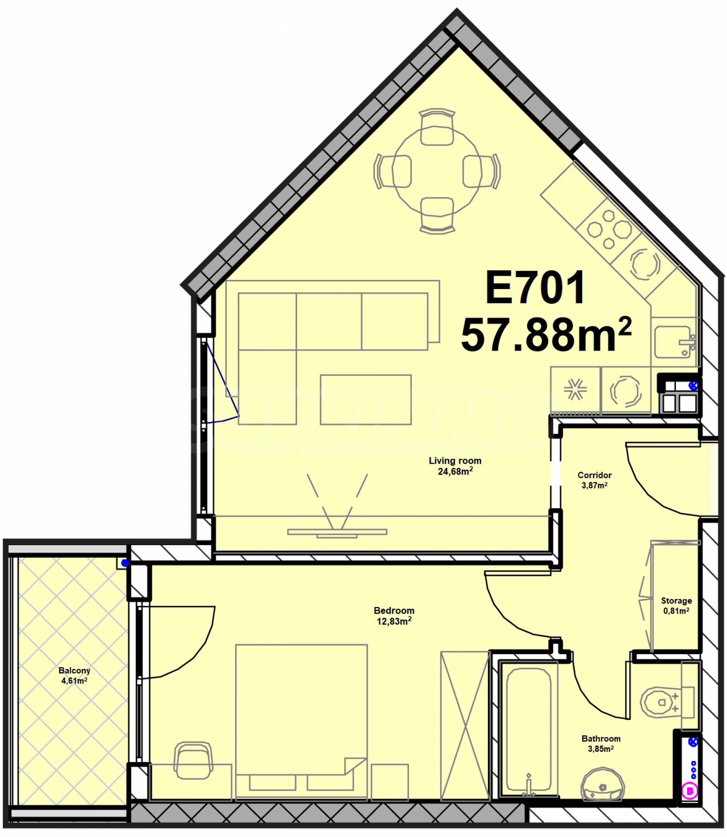Разпределение: обща площ 70,69 кв.м. (нетна площ 57,88 кв.м. + общи части 12,81 кв.м.) разположен на осми етаж.