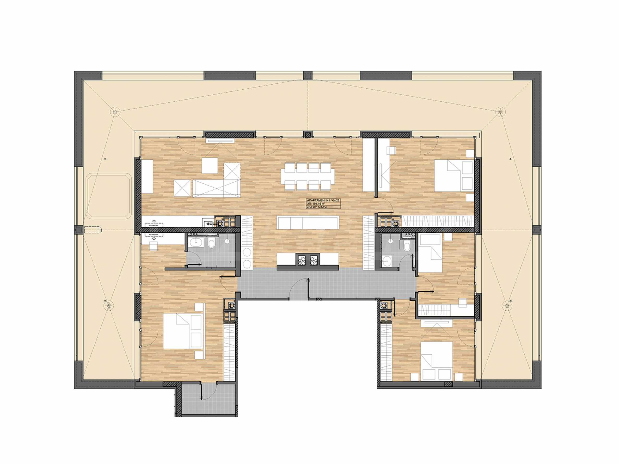The apartment is located on the 4th floor and has a total area of 243.91 sq m, 199.4 sq m - net area. The exposure is south/east/west/northwest.