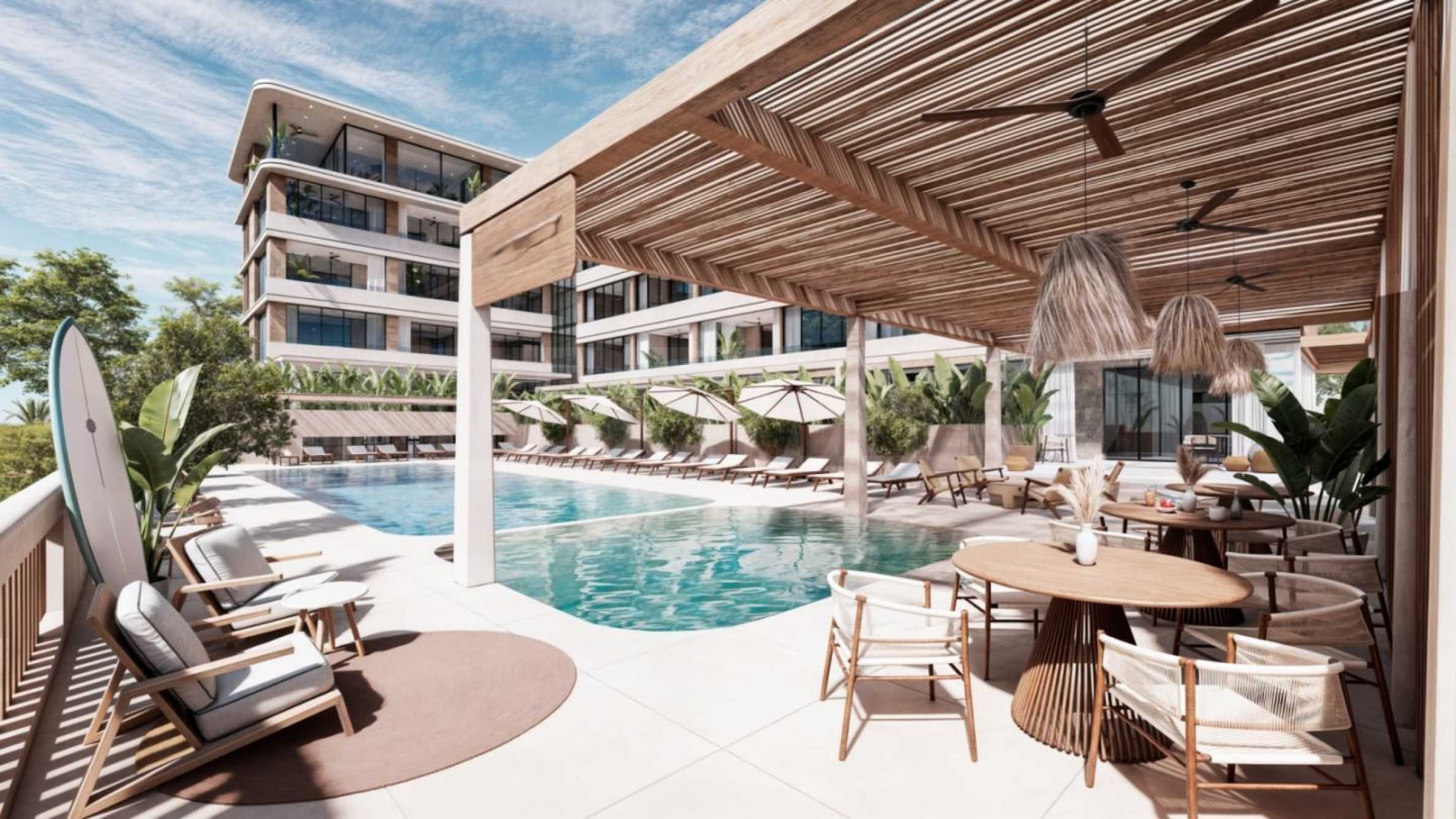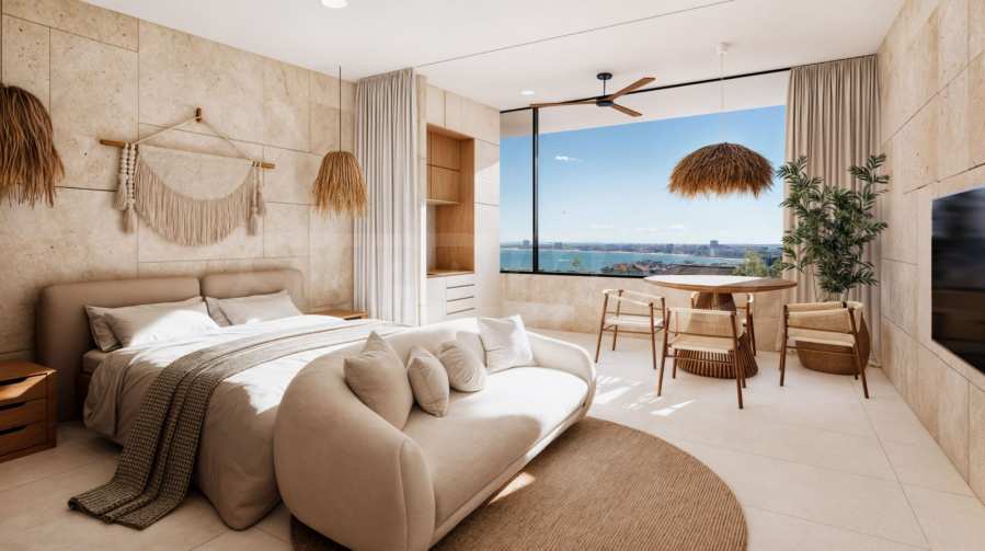 The building is designed on 5 floors and offers one-, two- and three-bedroom apartments with high ceilings (min. 2.75 meters) and an architectural innovation in the distribution, offering passive cooling and natural air circulation.