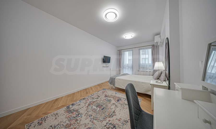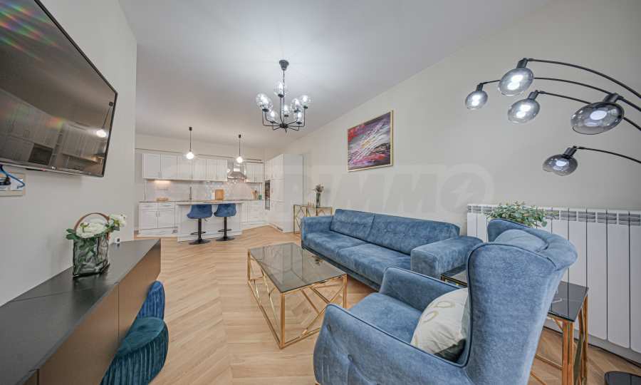 The apartment is luxuriously furnished and maintained in excellent condition. High-quality materials and appliances from proven brands have been used. The overall style of the interior is contemporary and elegant, with a balanced combination of light colors, soft accents and modern elements, which makes the home both practical and extremely pleasant to live in. The main room unites the living room, dining room and kitchen in one open space with modern lighting fixtures with artistic design. The kitchen is decorated in white. In the dining room we find a glass table with four elegant velvet chairs in sky blue, which add softness and color to the interior. The bedrooms are in the same style - light tones, soft fabrics and carefully selected furniture, which create a calm and relaxing atmosphere. They follow the clean lines of the home and bring a feeling of coziness and harmony.