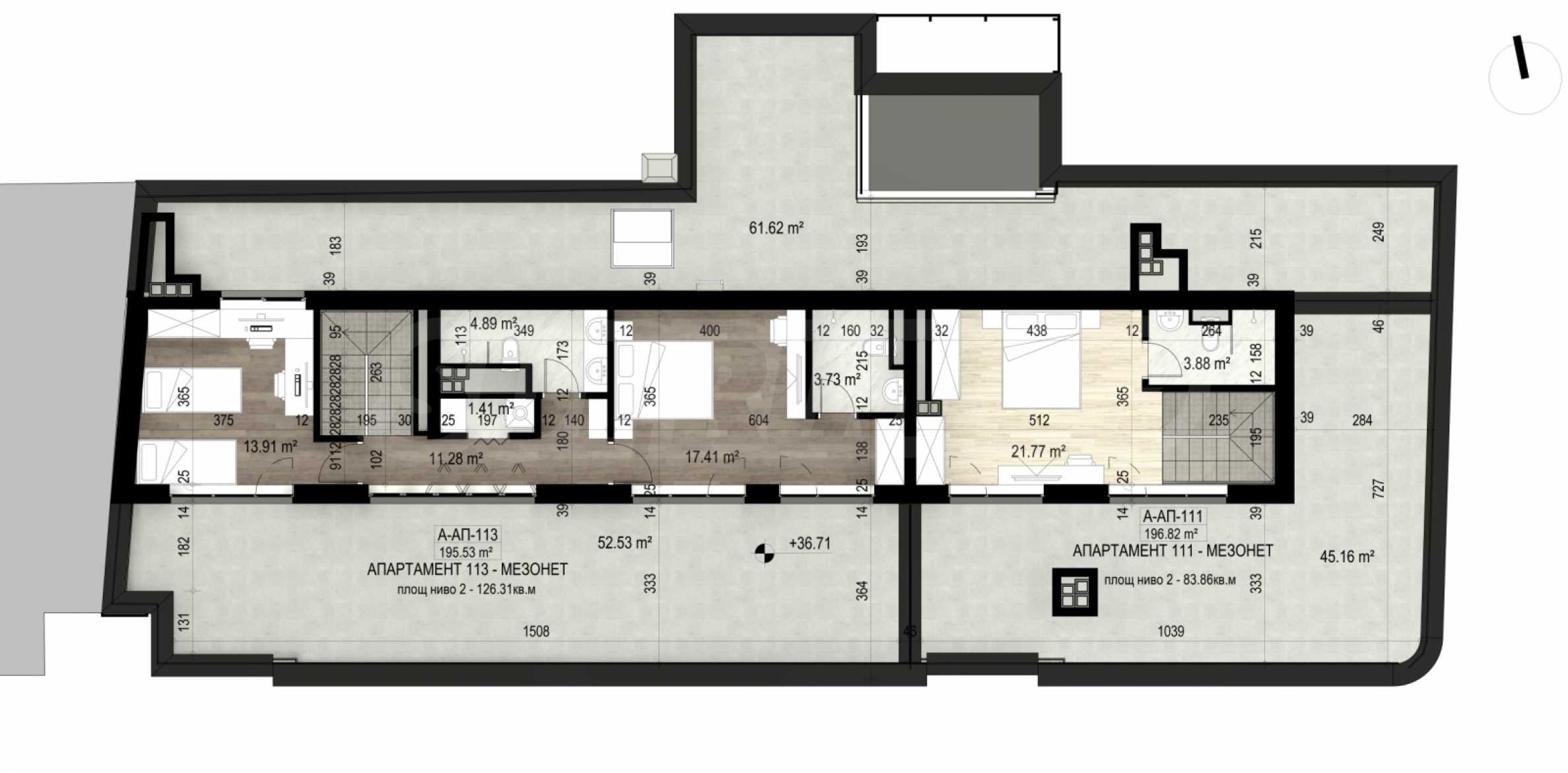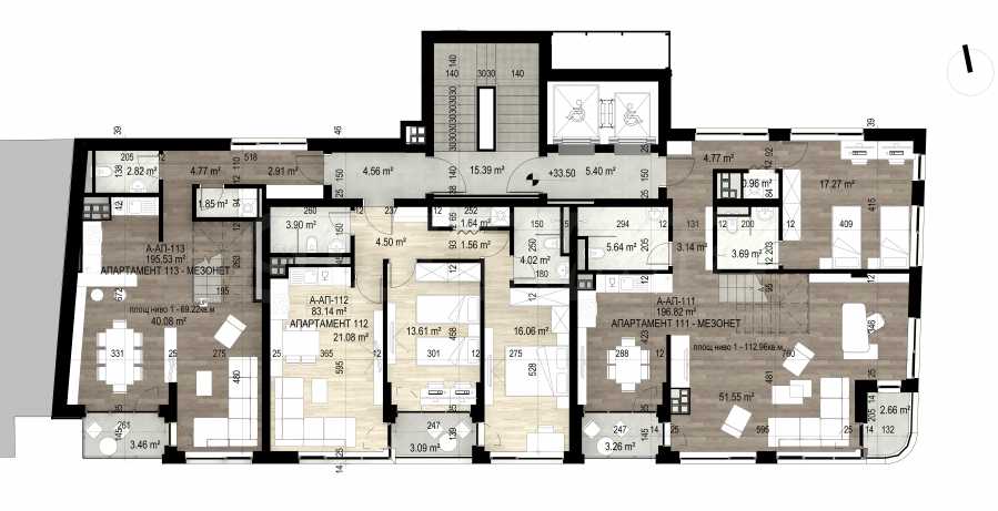 • Total area – 224.88 m2 (built-up area – 195.32 and 29.56 m2 – ideal parts of the common areas);