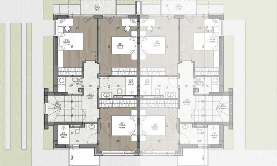 • distance between houses along the central alleys – 18 m;