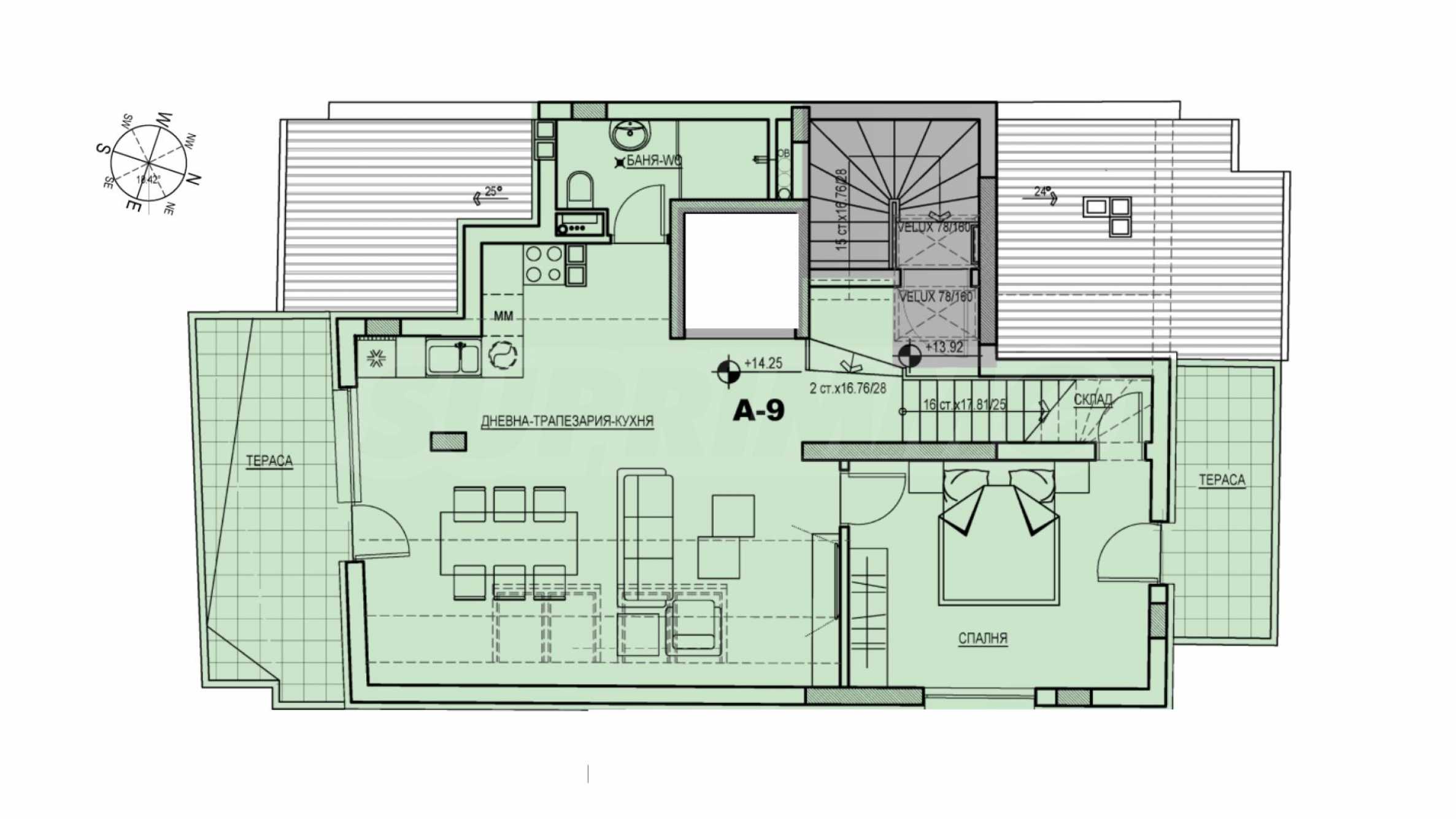 We present a panoramic three-bedroom penthouse on two levels, in the top center of the capital, in close proximity to the National Palace of Culture.