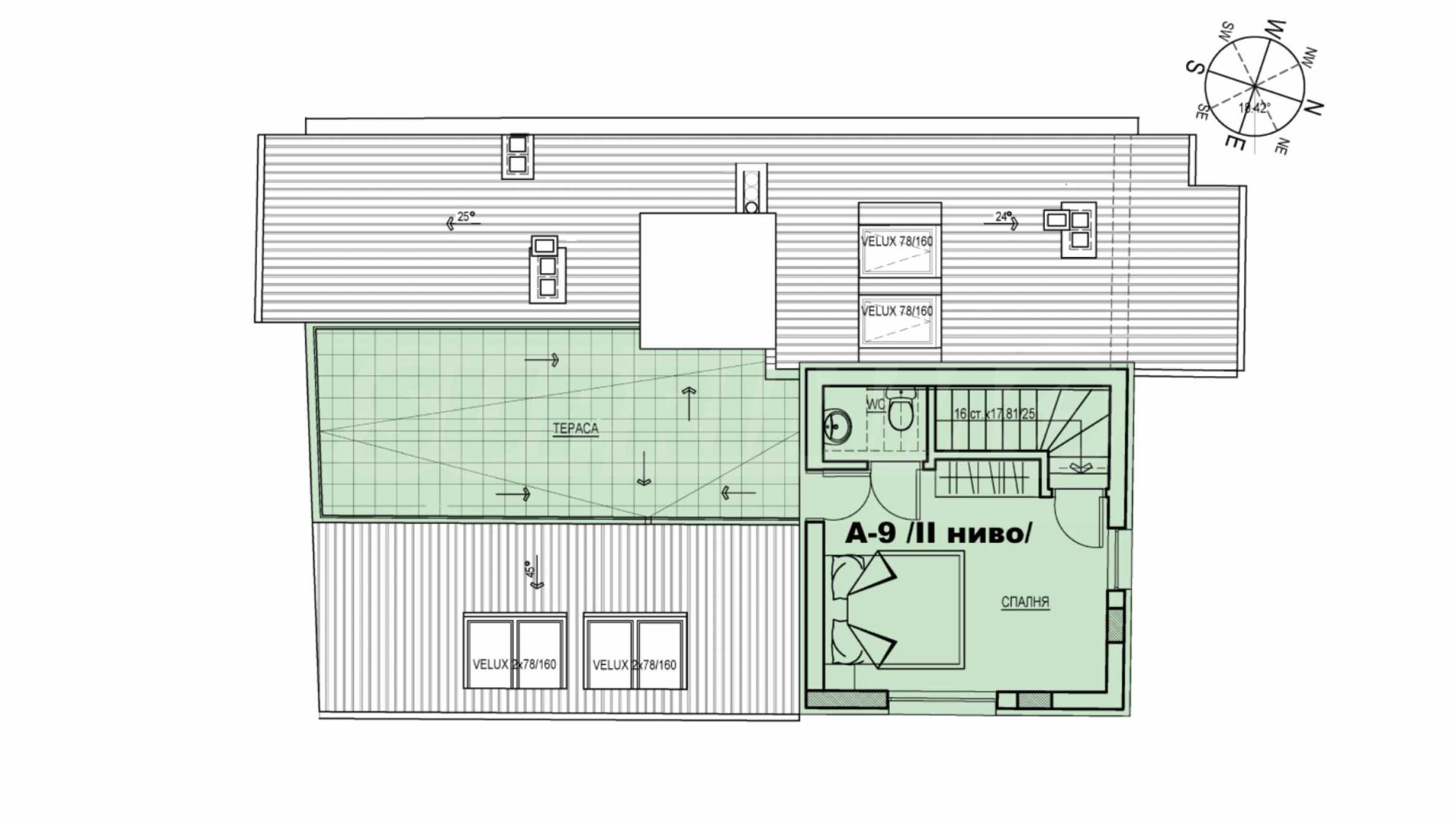• first level - entrance hall, living room with dining area and kitchen, bathroom with toilet, bedroom, storage room, two terraces and internal staircase, internal elevator;