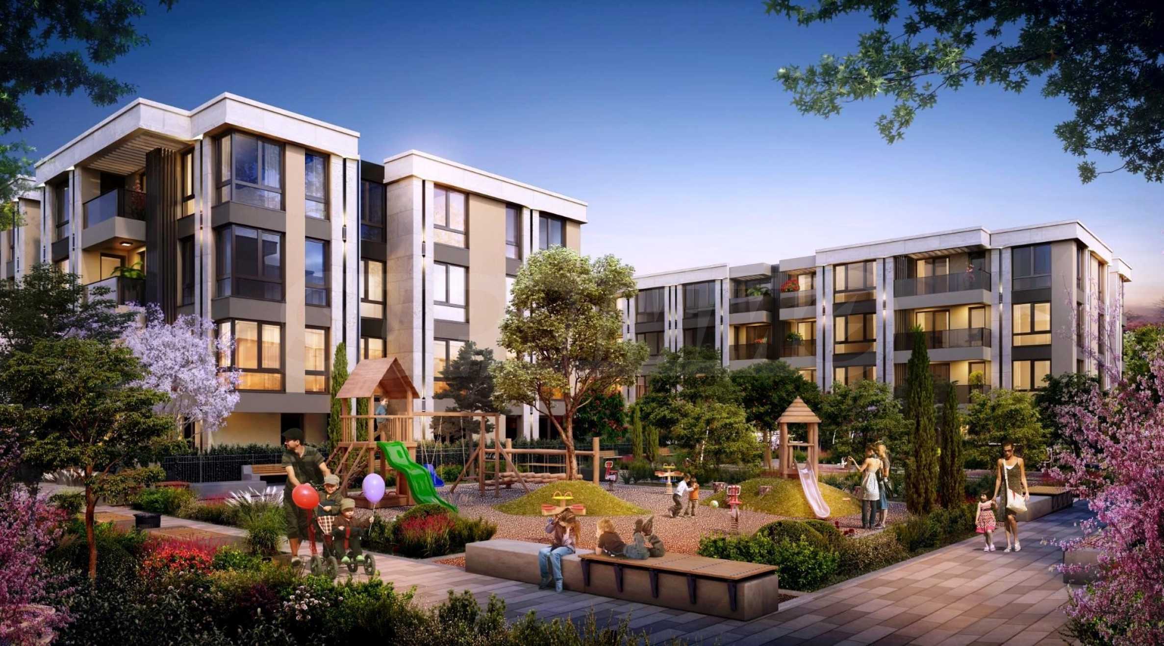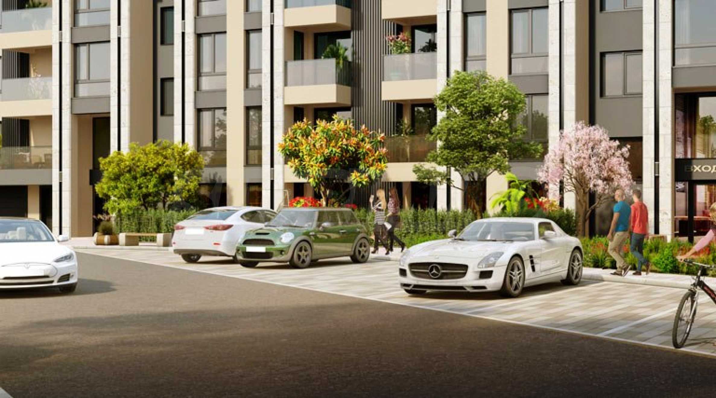 The complex will stand out with the greenery of the inner courtyard - its own park, which will be built on a plot of 4000 m2, under which there is no underground parking planned, and the tree species will be able to develop their root system freely. Thus, over time, the gardens will acquire a beautiful natural appearance. This component of the design for greenery and the connection with nature is a major part of the concept. In the planning of the adjacent terrain to the buildings, parking and car access will be organized on the periphery of the complex, so as to preserve its interior, where a safe and clean park environment can be developed.