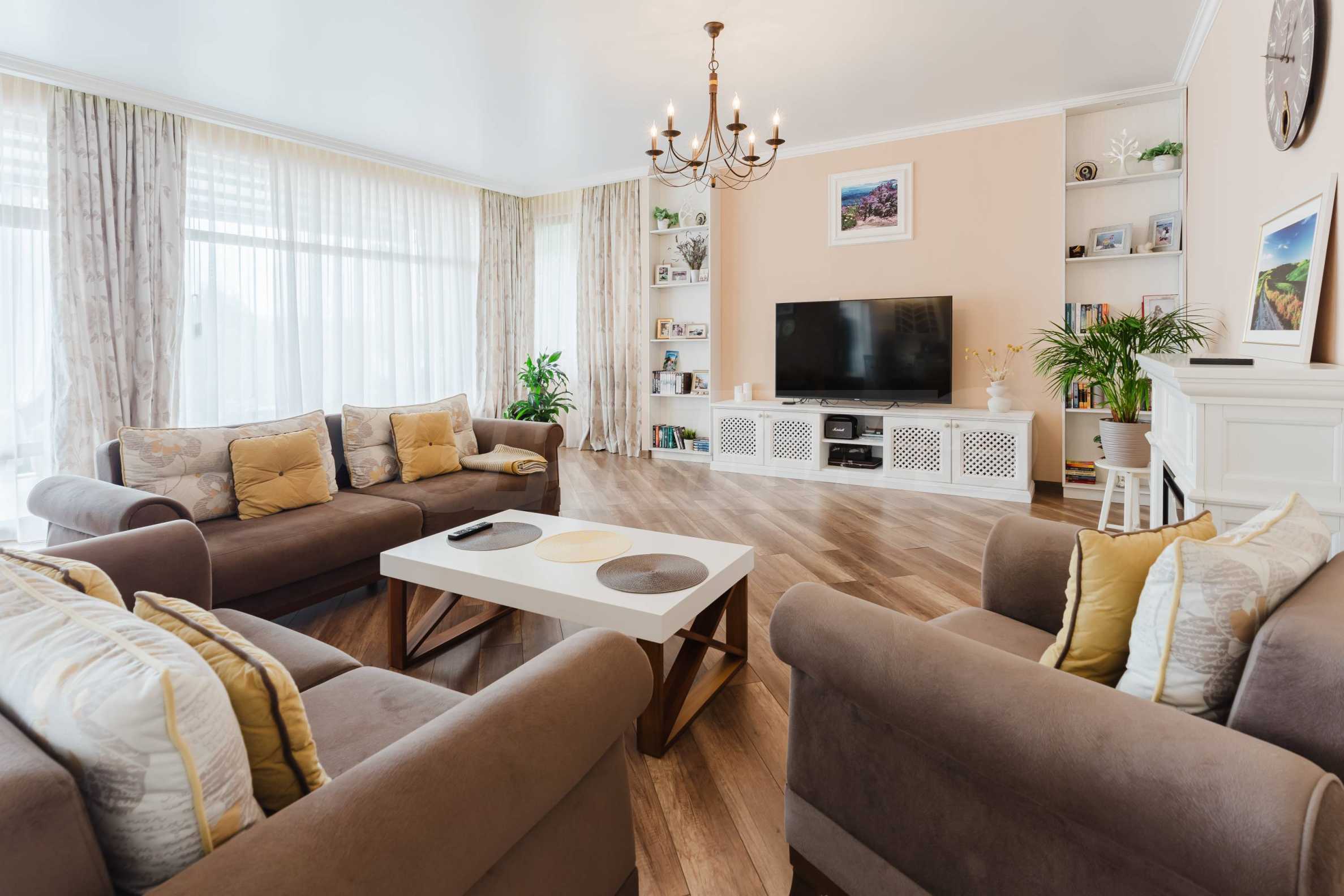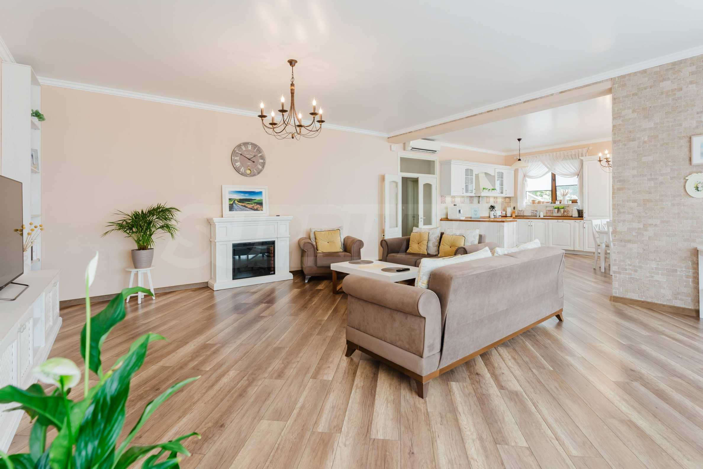 • living room with dining area: dining table with 6 chairs, high-class upholstered furniture, coffee table, TV, air conditioning, fireplace;