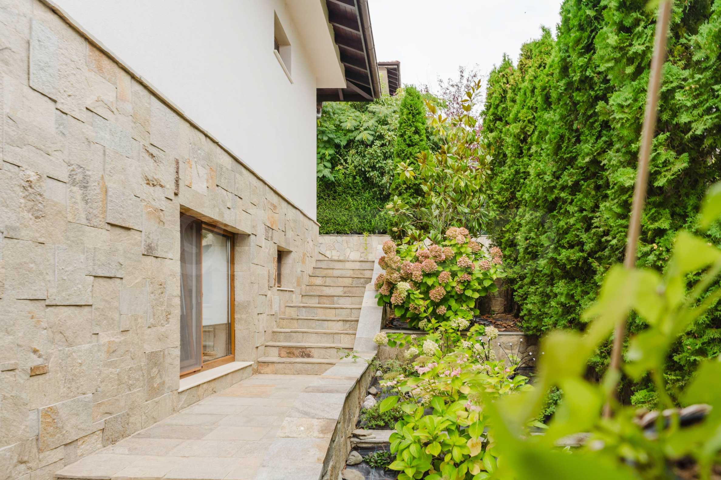 The yard is richly landscaped, with a massive fence with a gate, a separate barbecue area and 2 parking spaces.