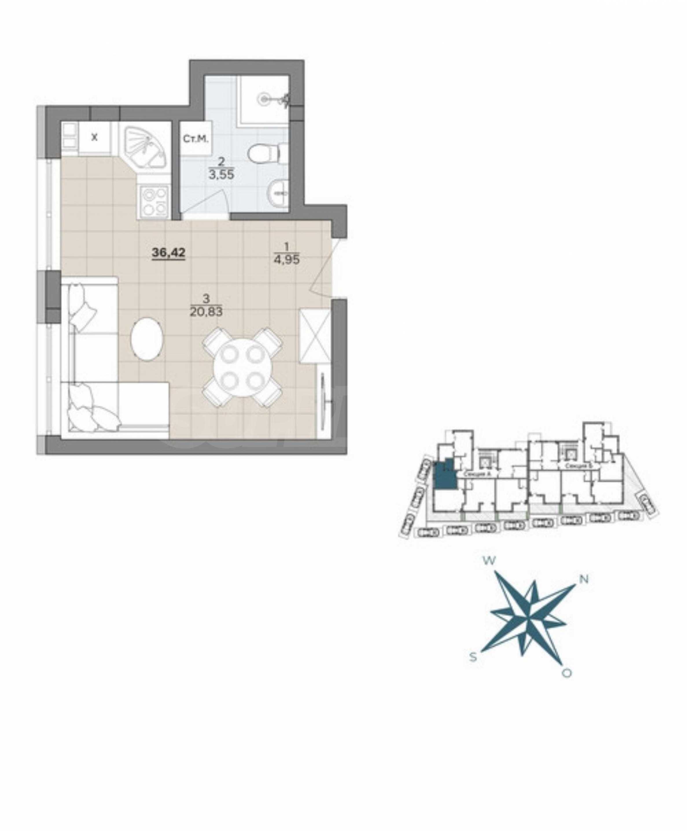 The apartment with a total area of 36 sq.m is located on the 1st floor of 6.