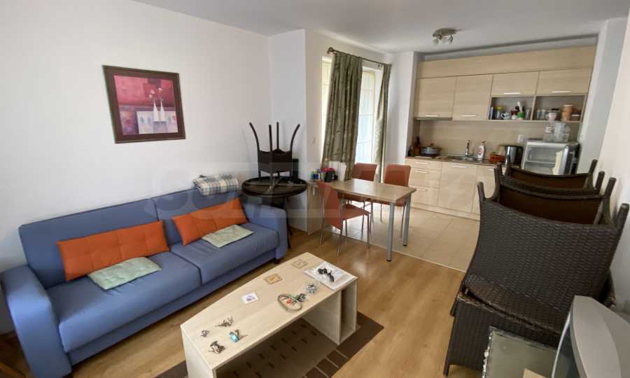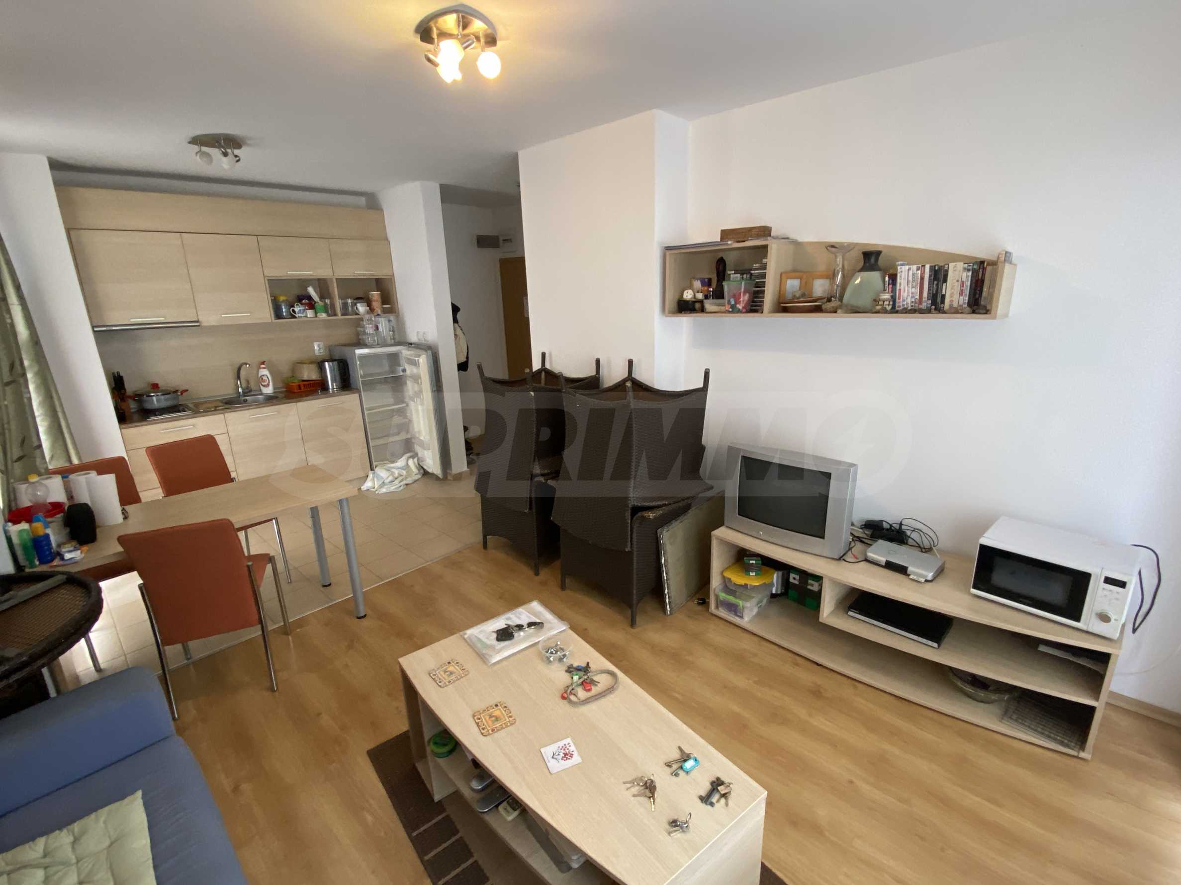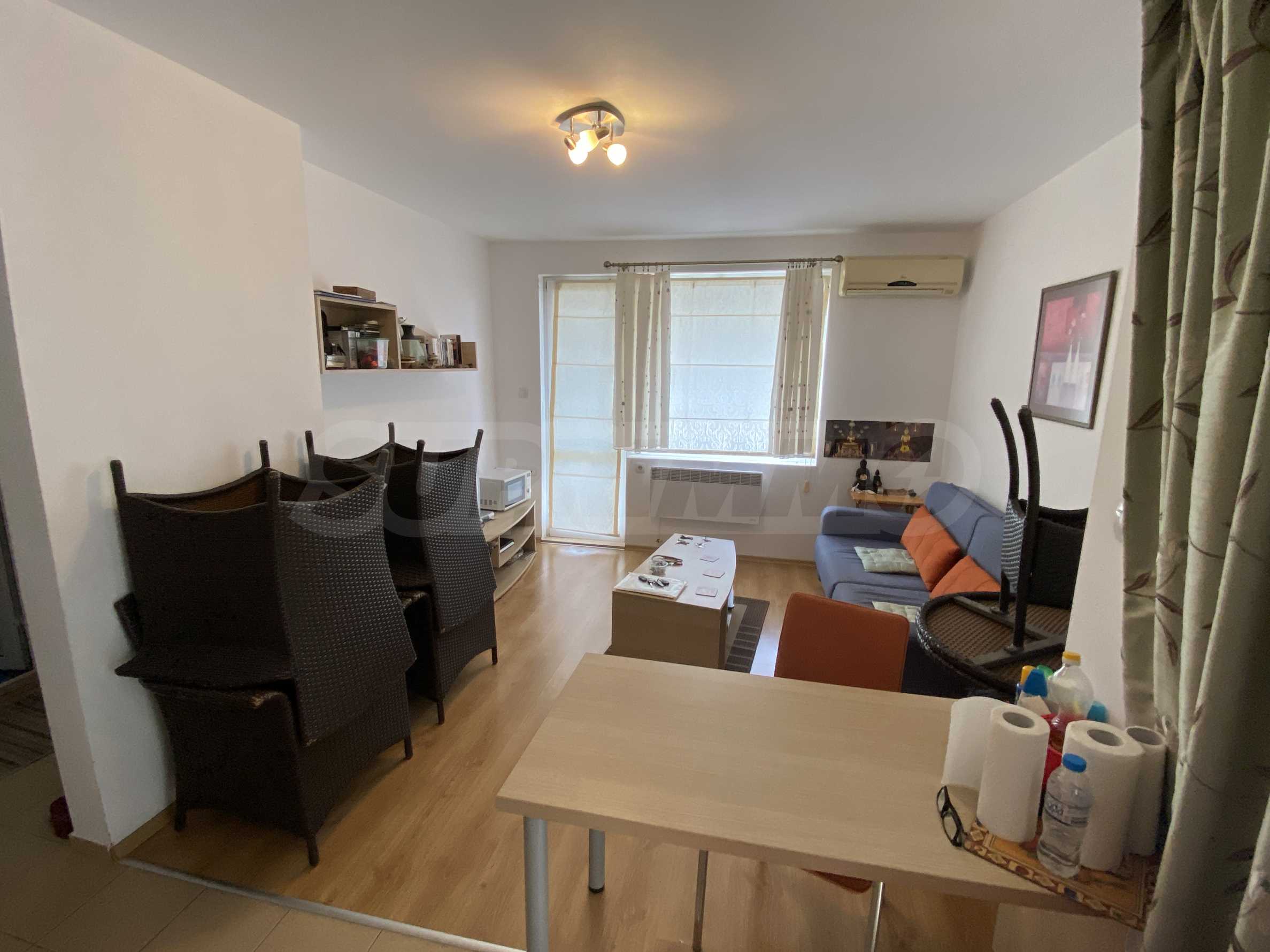 The apartment features latex walls, laminate flooring and PVC windows. Heating and cooling are provided by inverter air conditioning and electric convectors. The apartment comes fully furnished and equipped with everything necessary for comfortable living.