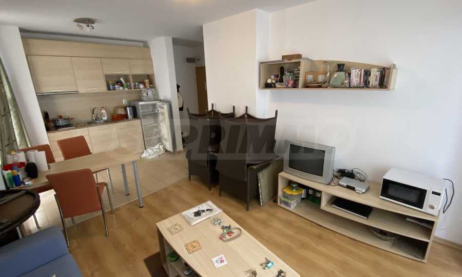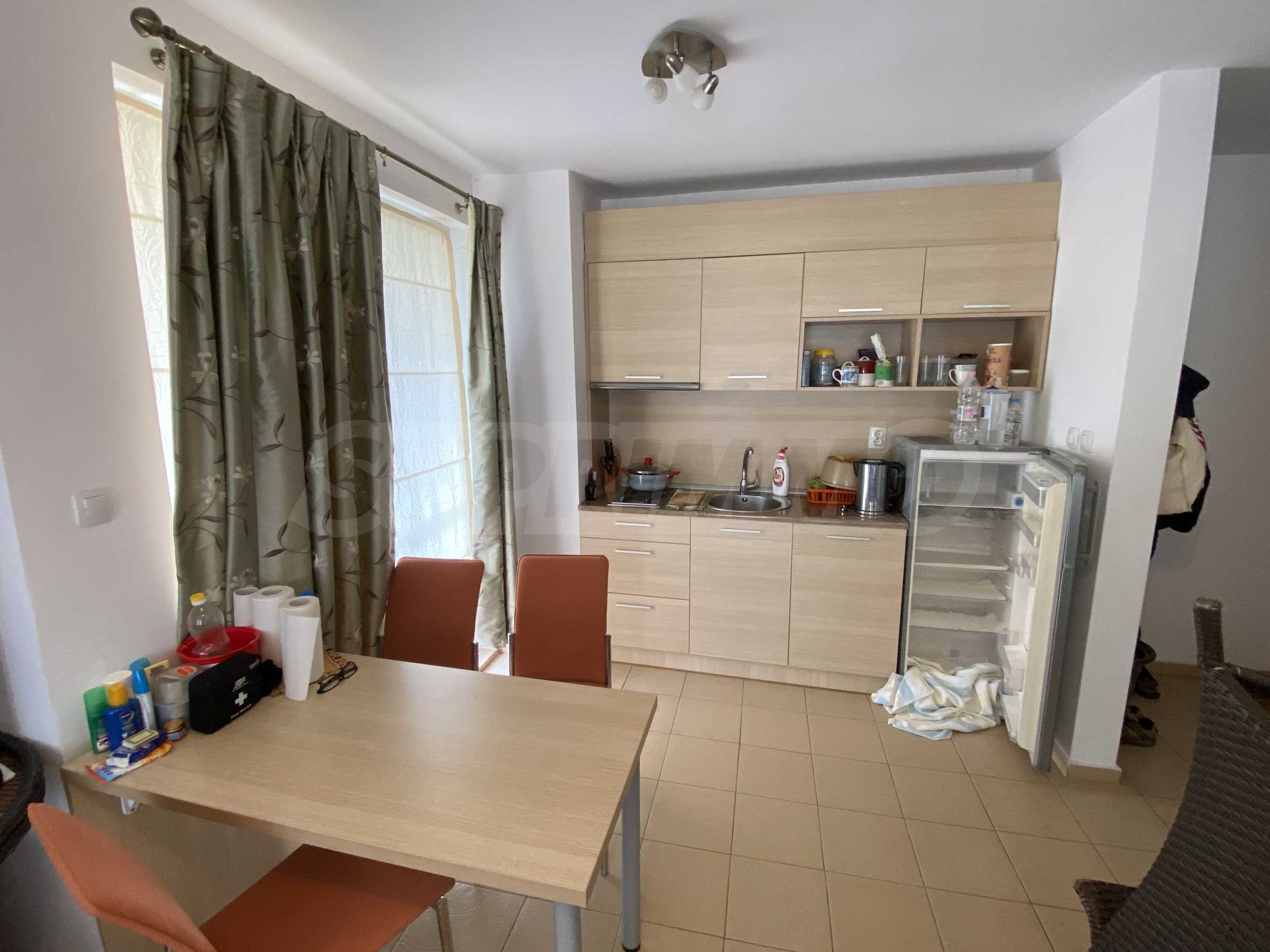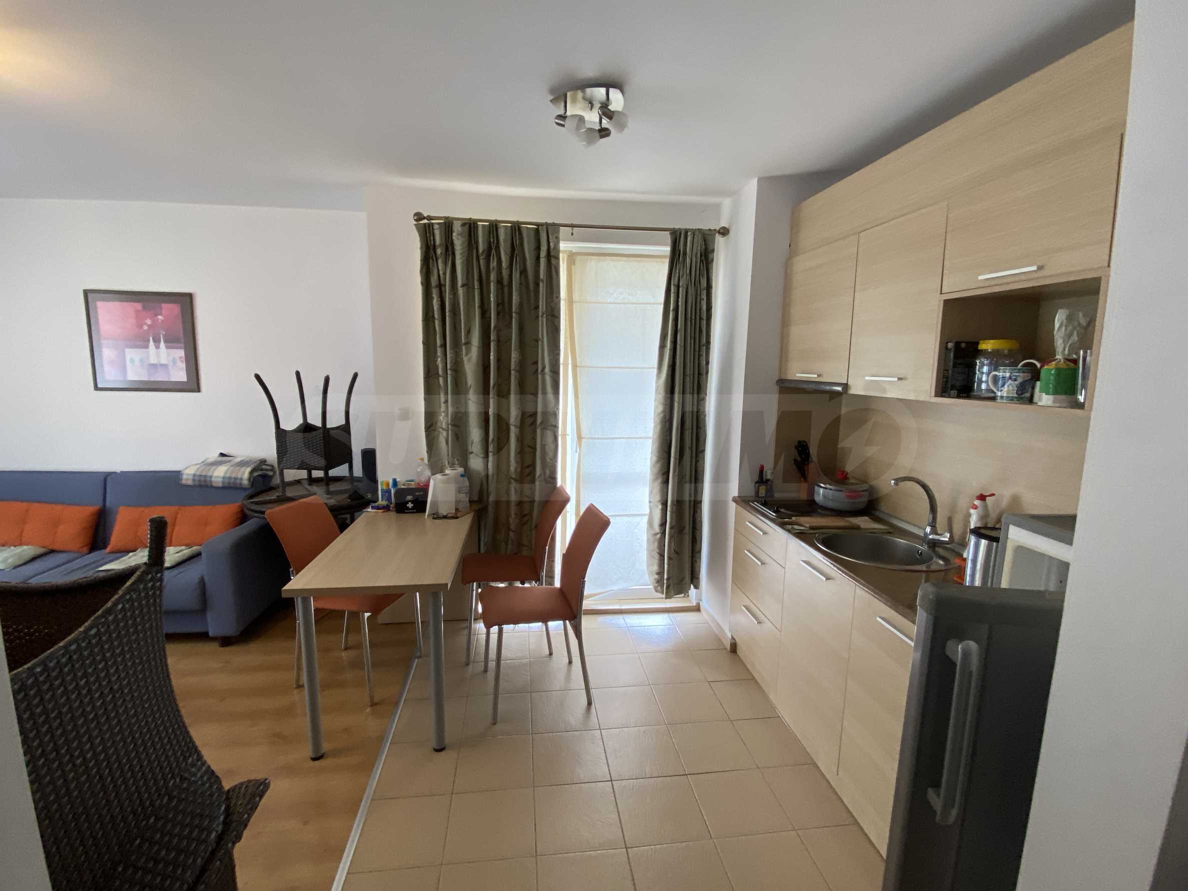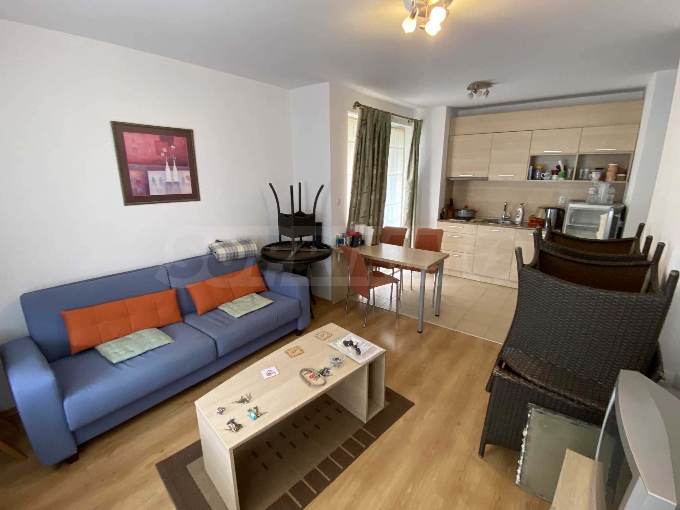 The apartment features latex walls, laminate flooring and PVC windows. Heating and cooling are provided by inverter air conditioning and electric convectors. The apartment comes fully furnished and equipped with everything necessary for comfortable living.