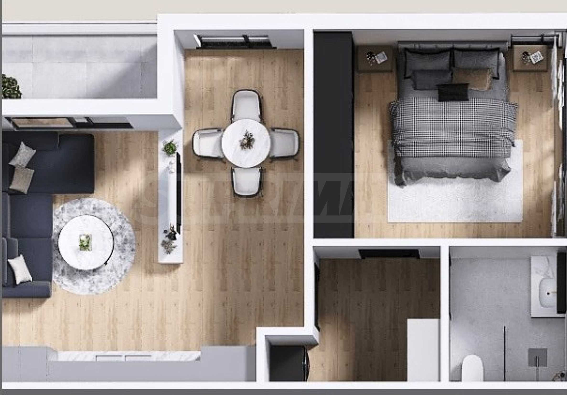 We present a one-bedroom apartment in a modern gated complex of high-class new construction, in a park environment in the "Kamenitsa 2" district. The buildings are located in close proximity to Mall Plaza, with direct pedestrian access between the complex and the shopping center. This provides convenient access to shops, services, restaurants and leisure areas - without the need for a car. A few minutes walk away are "Lauta" Park, a large hypermarket, as well as main road connections that connect the area with the central part of the city. The location offers practicality, good organization and easy access to everything that matters in everyday life.