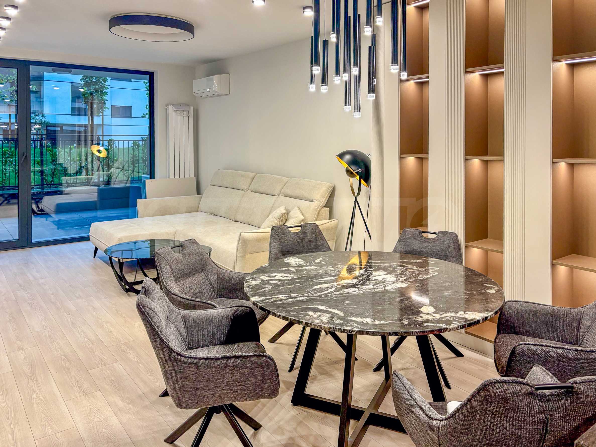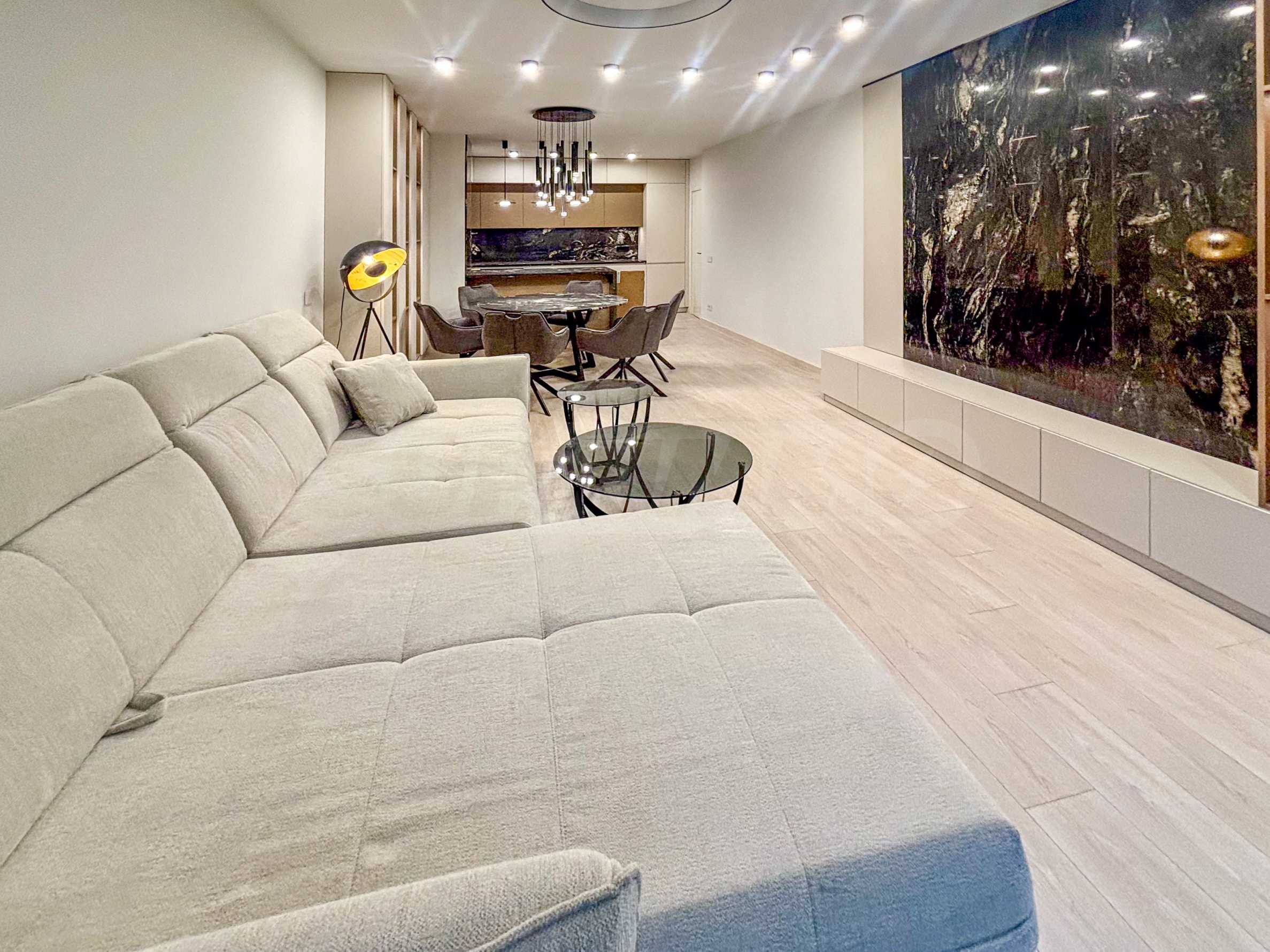 The living area is furnished with modern furniture: comfortable sofas, a massive dining table and designer lighting for coziness and luxury. Large French windows provide natural light throughout the day.