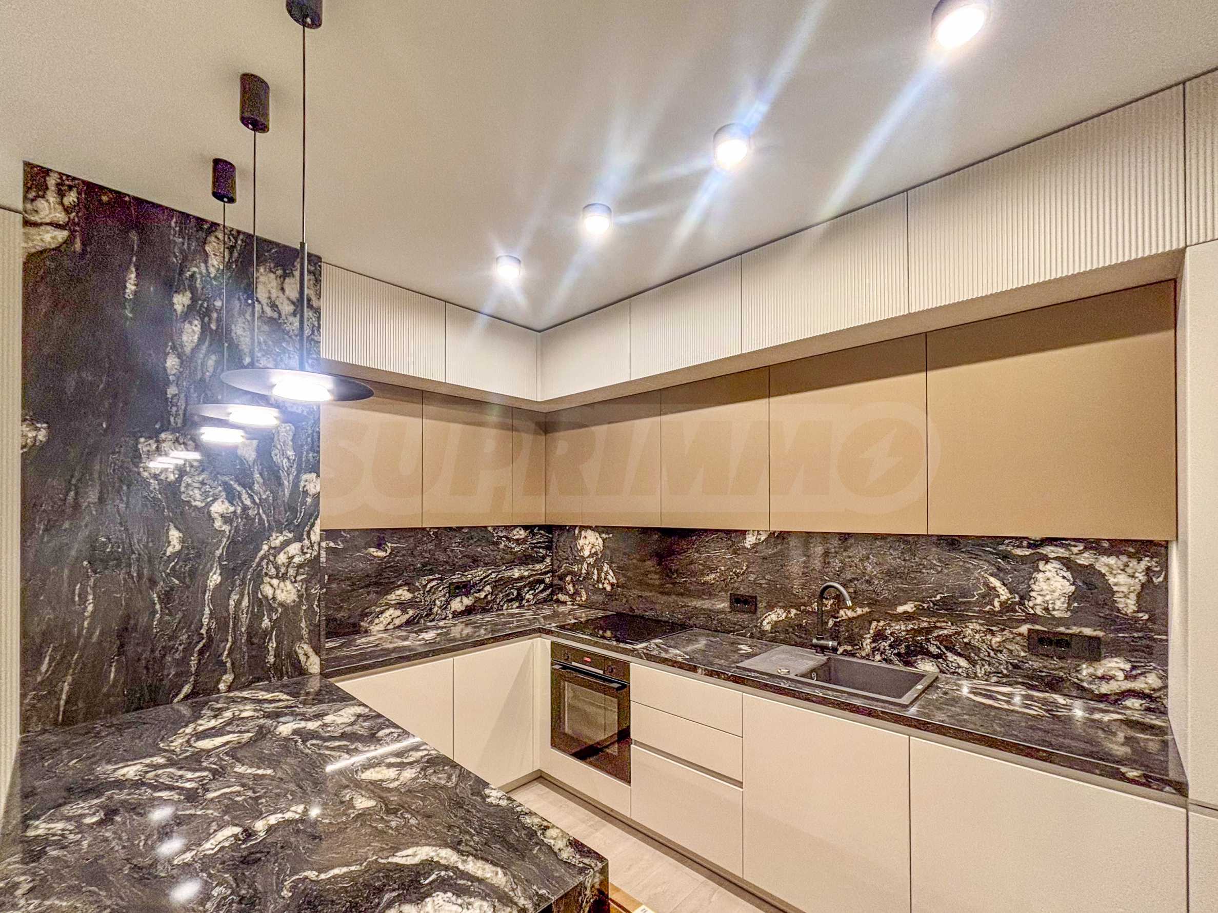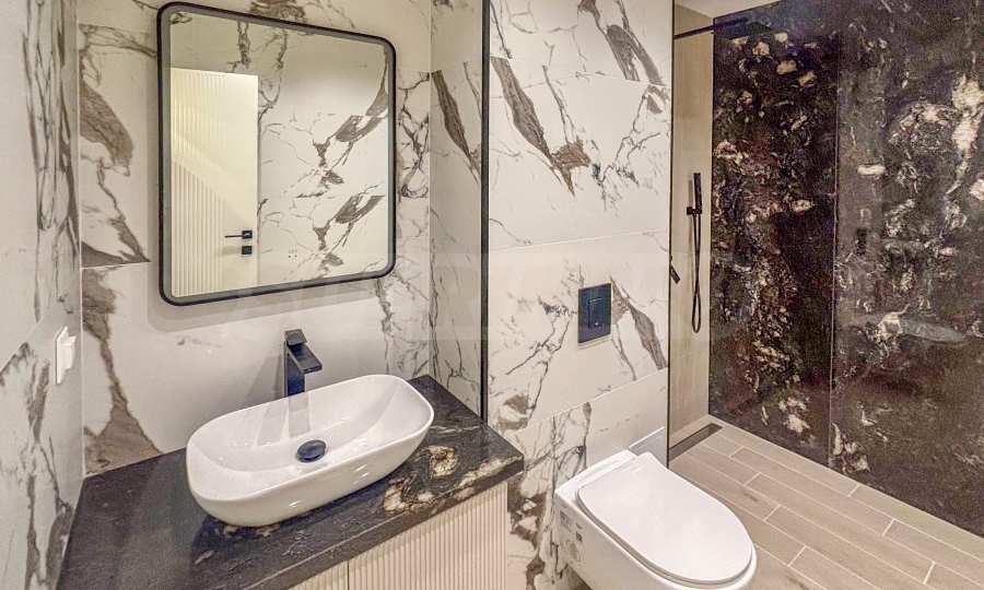 The apartment is part of a modern complex at the foot of Vitosha Mountain, with impressive architecture with clean lines and a suspended facade made of large-format Laminam slabs.