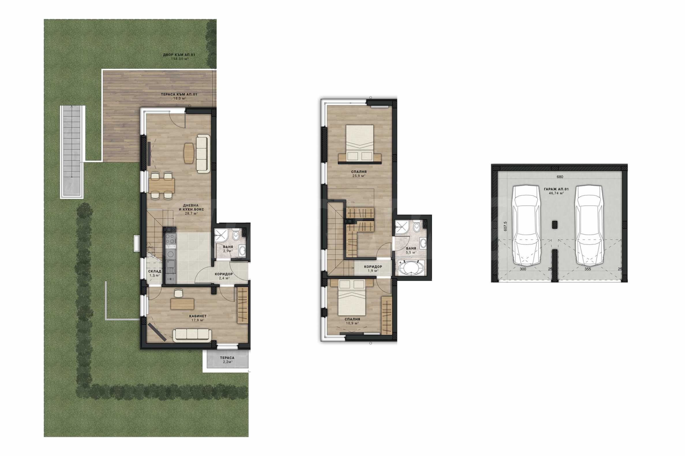 • On the first level – entrance hall, corridor, living room with kitchen, bathroom with toilet, bedroom, exit to a private garden;