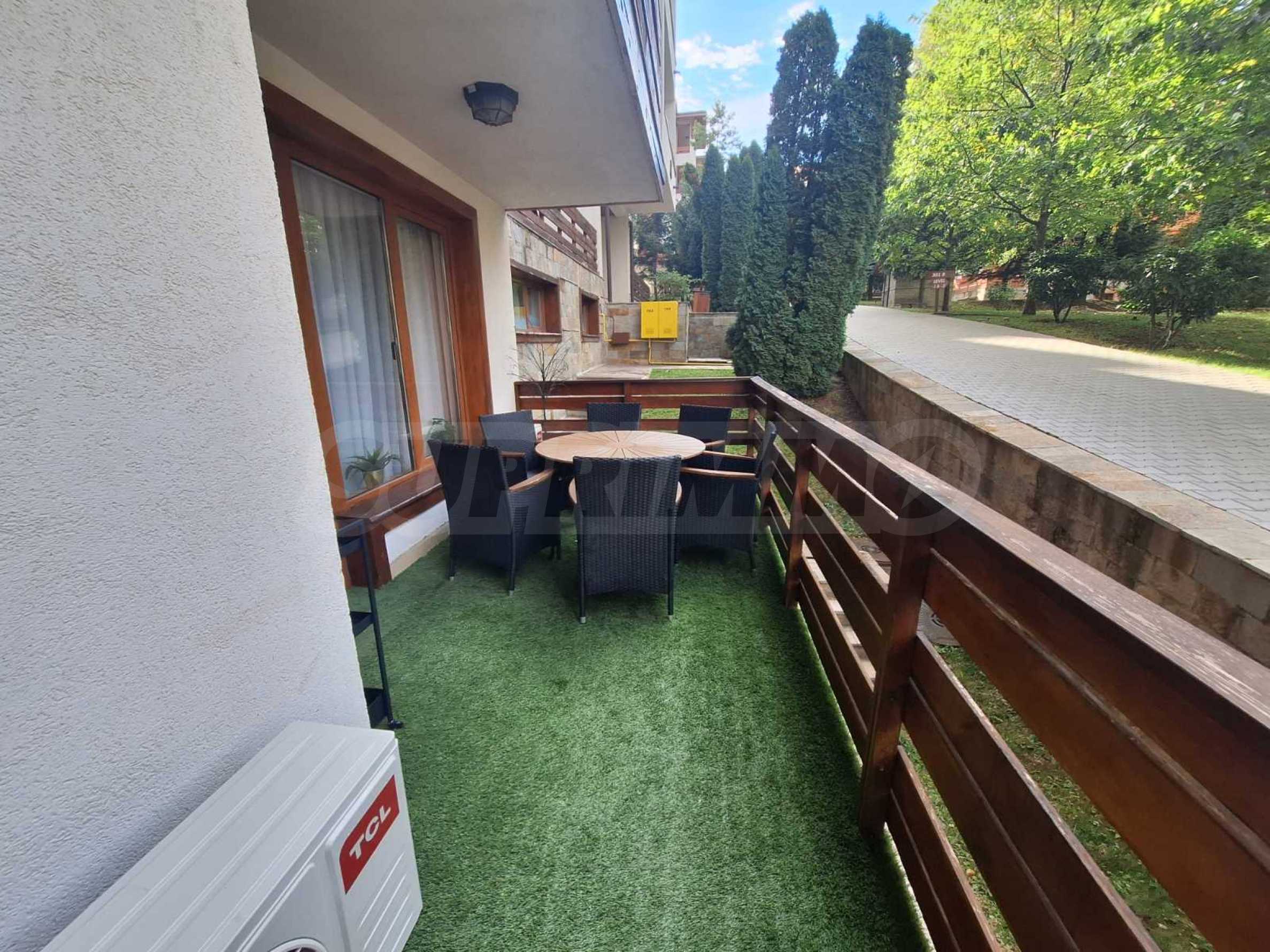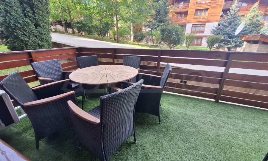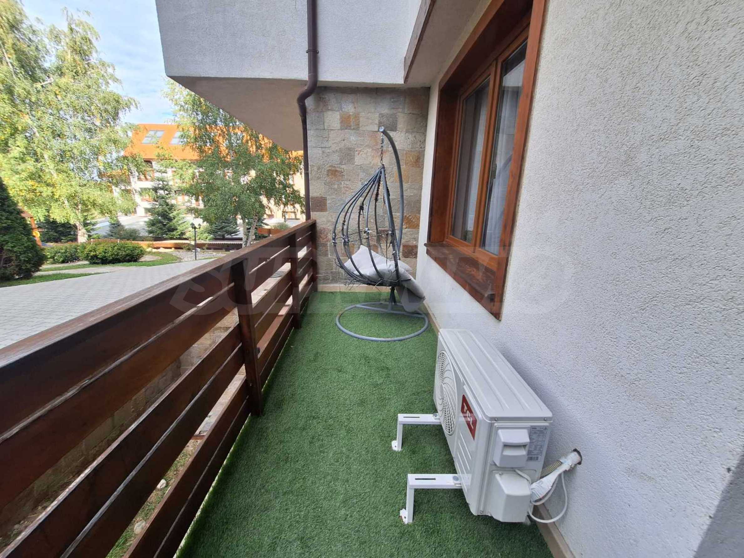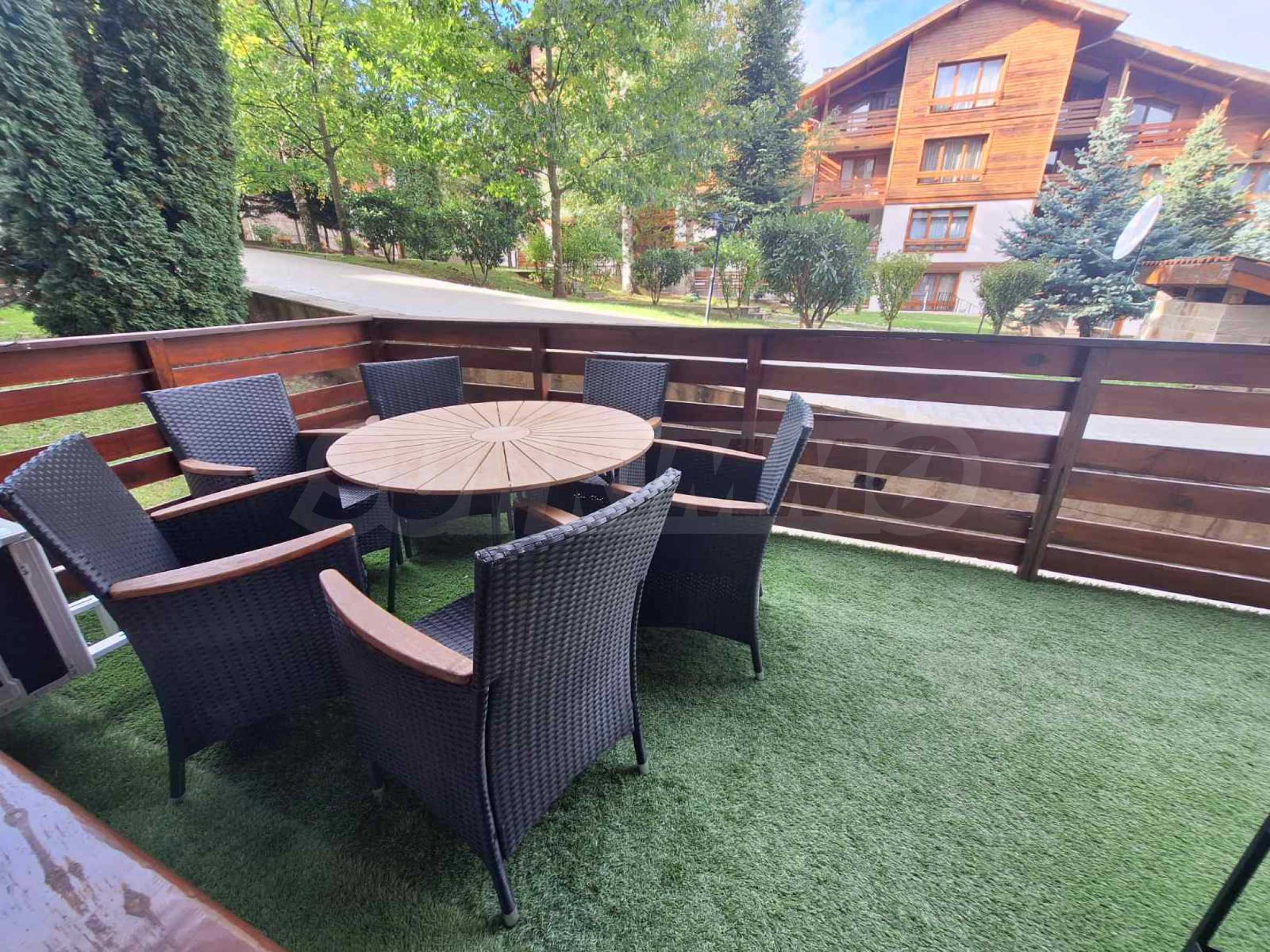The apartment is located in a house behind the main building. Each house has: a massage area, sauna, steam bath, ski wardrobe, large barbecue with fireplace, billiard table. All these extras are intended only for the owners. The owners will enjoy fresh mountain air and views of Pirin. The charming interior gives the feeling of home comfort.